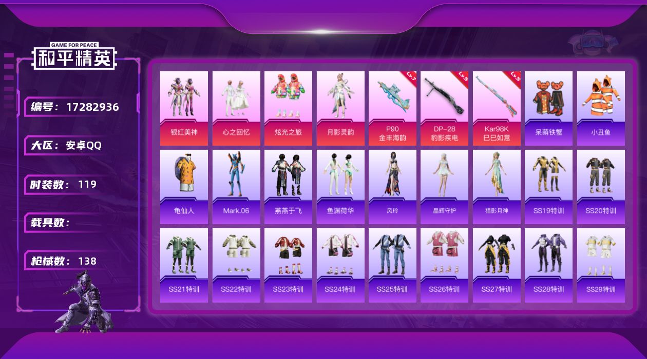 [17282936]安卓 手Q-4粉装-4特效枪-0载具-1粉色飞行器-41862热力值-17王牌印记-119套装-138枪皮 【热门品类】:套装-小丑鱼,套装-龟仙人,角色-Mark.06 【粉色套装】:粉装-银红美神,粉装-心之回忆,粉装-炫光之旅,角色-月影灵韵 【粉色枪皮等级】:P90-金丰海韵(七级),Kar98K-巳巳如意(五级),AA12-G-萌骑幻想(五级),DP-28-豹影疾电(五级) 【粉色枪皮】:P90-金丰海韵,Kar98K-巳巳如意,AA12-G-萌骑幻想,DP-28-豹影疾电 【粉色飞行器】:纯梦嫁纱飞行翼 【粉色降落伞】:旋转彩虹降落伞,音爆索尼克降落伞,炫彩糖果降落伞 【稀有套装】:套装-龟仙人,套装-燕燕于飞,套装-鱼渊荷华,角色-风玲,套装-晶辉守护,角色-猎影月神 【稀有枪皮】:AKM-2P战斗服款,AKM-影袭,AKM-破晓战魂,AKM-缤纷海域,AKM-龙的传人,M16A4-幻世战舞者,M16A4-红色方程式,M16A4-蓝色火焰,SCAR-L-炫彩节奏,SCAR-L-玉兔迎春,SCAR-L-红色方程式,M416-彩虹嘻嘻猴,M416-糯团青竹,M416-红色方程式,M416-蓝色火焰,GROZA-田园牧歌,GROZA-荧海星豚,GROZA-晶梦幻蝶,AUG-天降萌叽,AUG-耀粉歌者,QBZ-彩虹符号,QBZ-飞驰魅影,M762-天降萌叽,M762-第五大道,Mk47-妙红点点,蜜獾-天降萌叽,蜜獾-娇憨猪猪,UZI-啾咪啾咪,UZI-娇憨猪猪,UZI-红色方程式,UMP45-仲夏莫吉托,UMP45-蓝色火焰,Vector-田园牧歌,汤姆逊-天降萌叽,汤姆逊-耀粉歌者,AKS-74U-鬼刀,P90-飞驰魅影,P90-巳巳如意,Kar98K-炫彩节奏,Kar98K-飞驰魅影,M24-炫彩节奏,AWM-垂柳戏鸭,SKS-未来歌姬,SKS-炫彩节奏,SKS-迅猛狂鲨,VSS-星之彼岸,VSS-田园牧歌,Mini14-炫彩节奏,Mini14-耀粉歌者,SLR-娇憨猪猪,SLR-彩虹符号,AMR-妙红点点,M200-仲夏莫吉托,S686-生命誓言,S686-千金淑猫,S1897-炫彩节奏,S1897-飞驰魅影,S1897-荧海星豚,S12K-玩趣呆呆,S12K-音爆索尼克,S12K-娇憨猪猪,S12K-幻世战舞者,DBS-彩虹符号,SPAS-12-田