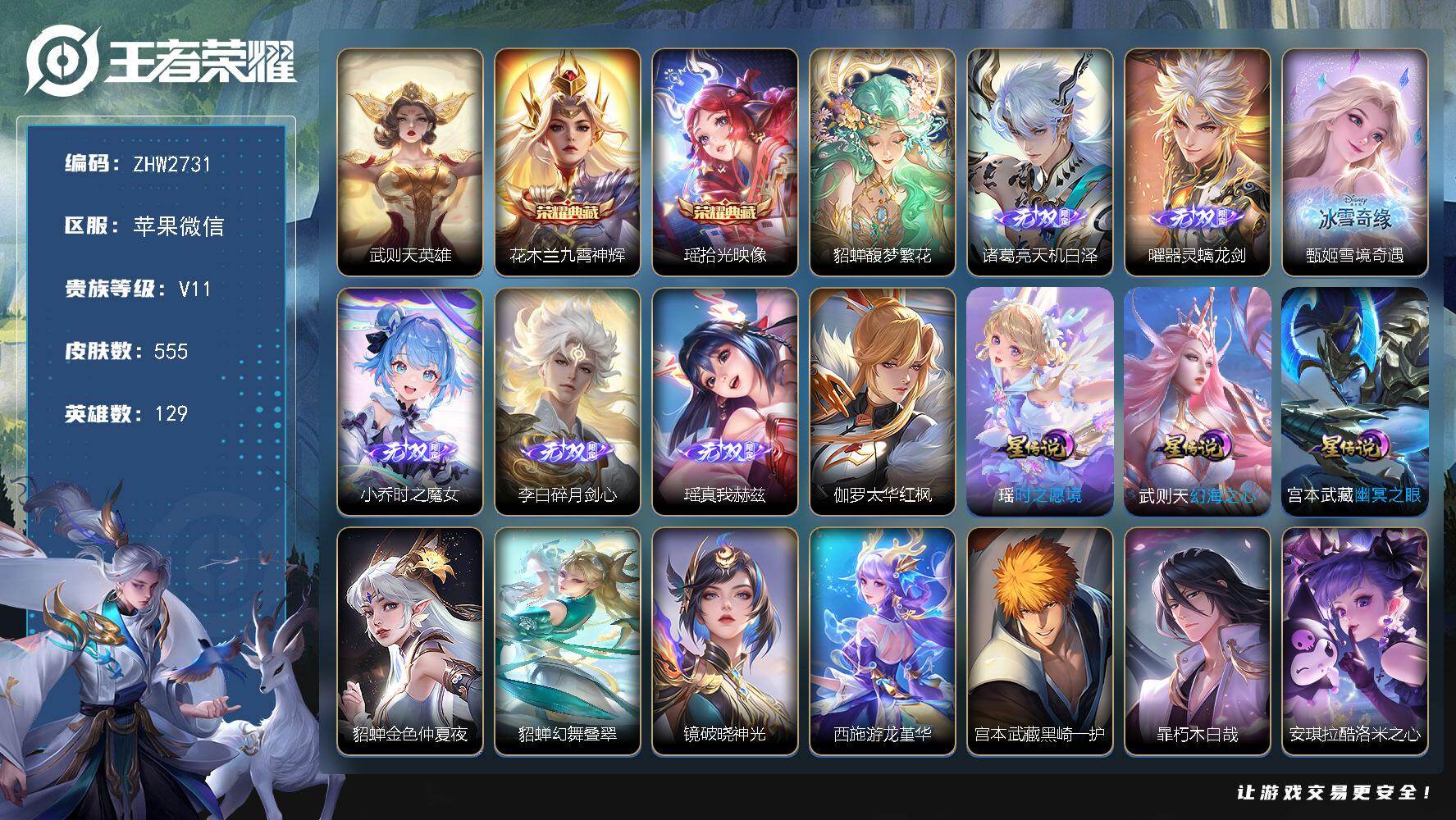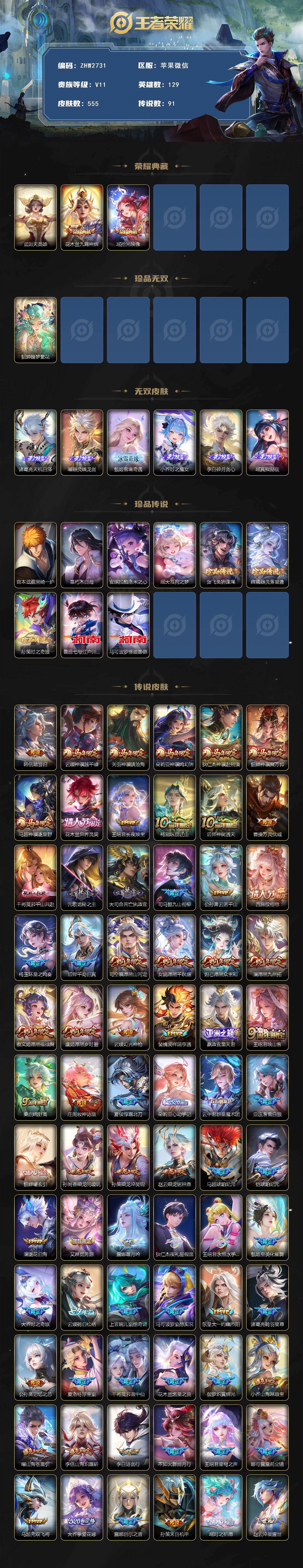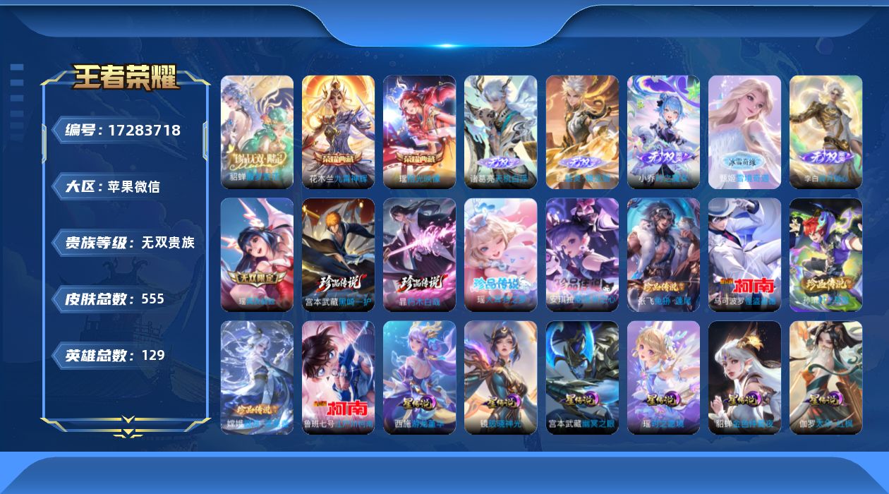 [17283718]女号!小国露娜-100个性按键-苹果WX-V11-最强王者段位-129英雄-555皮肤-2典藏皮肤-1典藏英雄-1珍品无双-6无双-9珍品传说-91传说-8星元-1天幕-175史诗