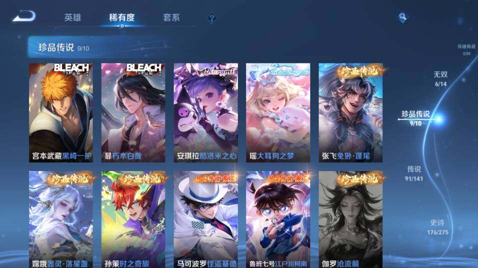 【珍品传说】:宫本武藏黑崎一护,暃朽木白哉,安琪拉酷洛米之心,瑶大耳狗之梦,张飞兔狲蓬尾,嫦娥器灵落星盏,孙策时之奇旅,鲁班七号江户川柯南,马可波罗怪盗基德