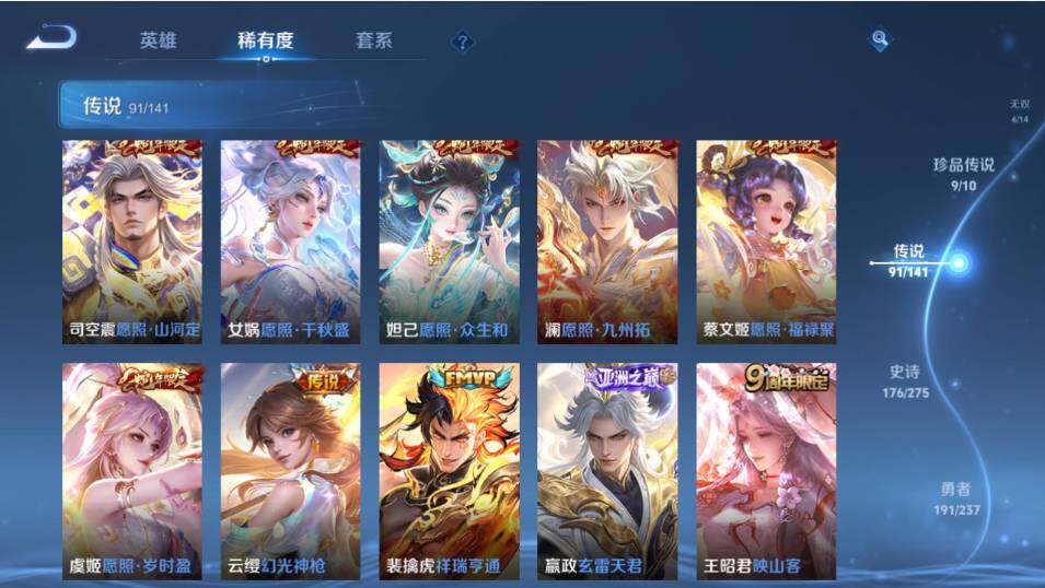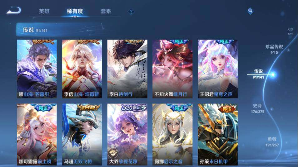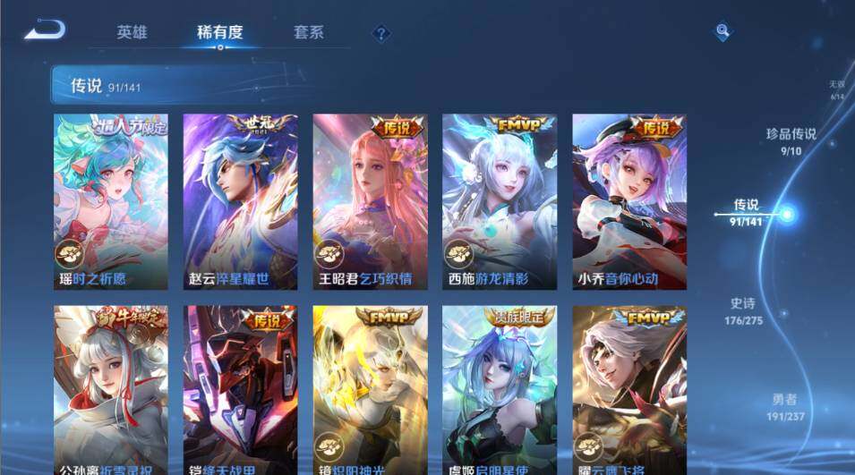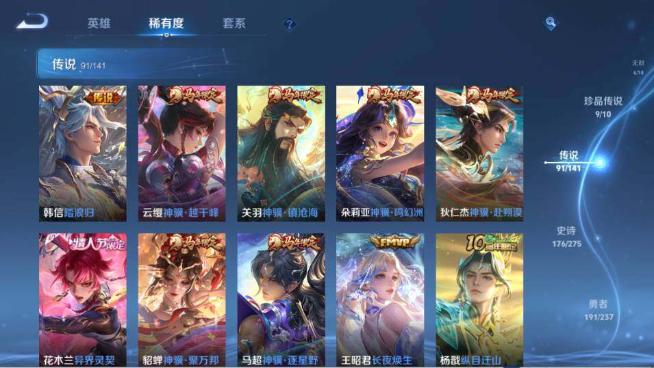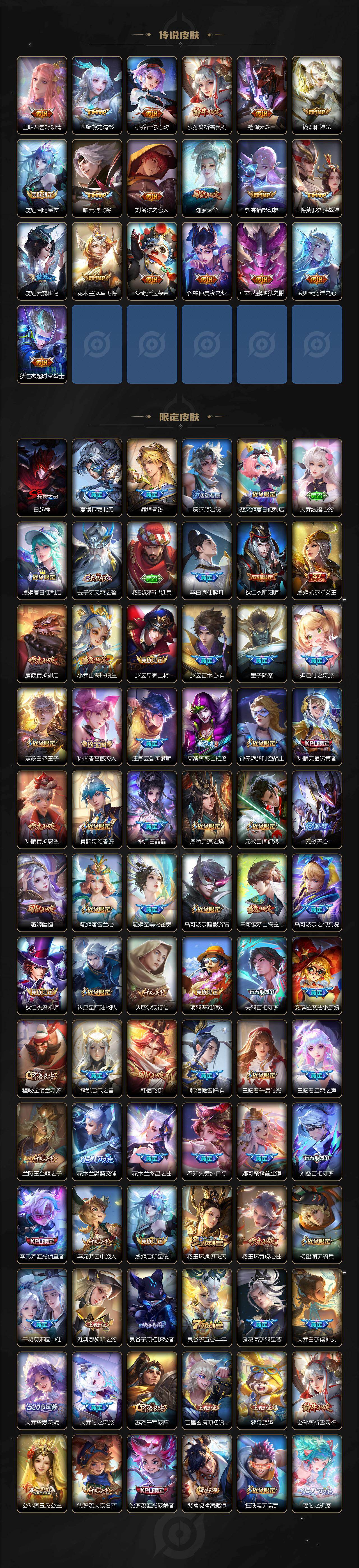 【传说皮肤】:韩信踏浪归,云缨神骥越千峰,关羽神骥镇沧海,朵莉亚神骥鸣幻洲,狄仁杰神骥赴朔漠,貂蝉神骥聚万邦,马超神骥逐星野,花木兰异界灵契,王昭君长夜焕生,杨戬纵目迁山,后羿神树通天,曹操万灵伏威,干将莫邪千山共赴,元歌诡秘之主,大司命死亡执政官,司马懿九山相柳,公孙离云诺千山,西施续相思,杨玉环星之鸣奏,后羿千劫归真,司空震愿照山河定,女娲愿照千秋盛,妲己愿照众生和,澜愿照九州拓,蔡文姬愿照福禄聚,虞姬愿照岁时盈,云缨幻光神枪,裴擒虎祥瑞亨通,嬴政玄雷天君,王昭君映山客,桑启鸣野蒿,庄周牧神诗旅,夏侯惇霜北刀,朵莉亚心动手记,云中君群星魔术团,亚连落雪白狼,貂蝉曦玄引,孙尚香乘龙问璇玑,孙策乘龙淬吴钩,赵云乘龙铭钟鼎,马超琥珀纪元,铠琥珀纪元,澜逐花归海,艾琳觅芳踪,露娜霜月吟,狄仁杰夜礼服假面,王昭君永恒水手月亮,甄姬至美化雀舞,大乔时之奇旅,云缨鹤归松栖,上官婉儿妄想奇谈,马可波罗妄想实况,东皇太一灼幽烈阳,诸葛亮鹤羽星尊,公孙离记忆之芯,夏洛特浮生妄,干将莫邪画中仙,花木兰燃星之曲,伽罗炽翼辉光,小乔山海琳琅生,曜山海苍雷引,李信山海炽霜斩,李白诗剑行,不知火舞绯月行,王昭君星穹之声,娜可露露前尘镜,马超无双飞将,大乔挚爱花嫁,露娜启示之音,孙策末日机甲,瑶时之祈愿,赵云淬星耀世,