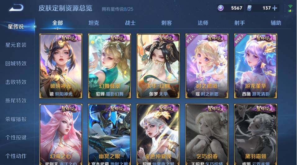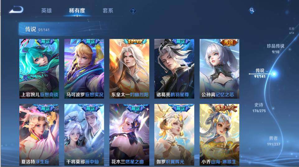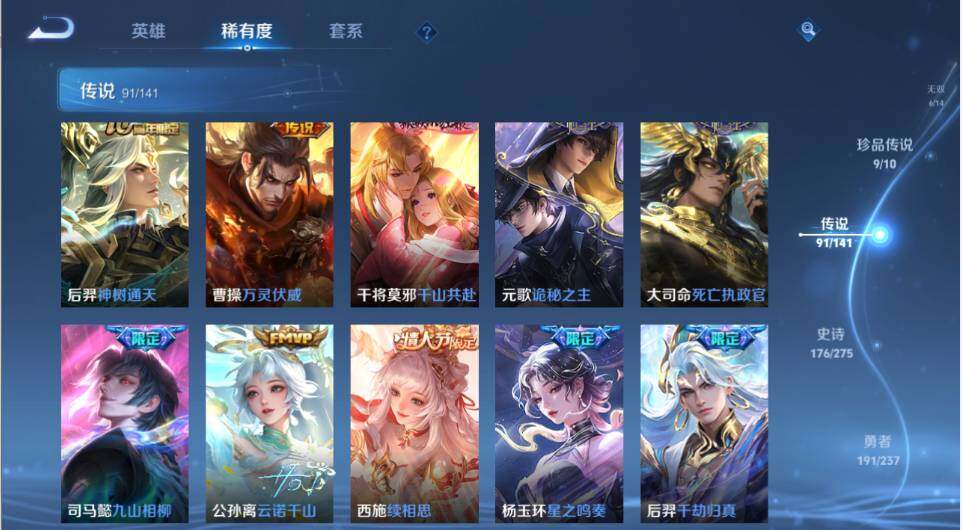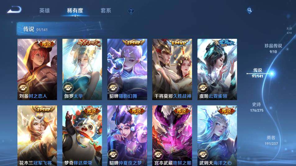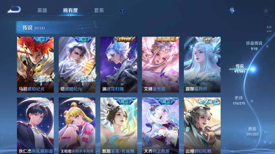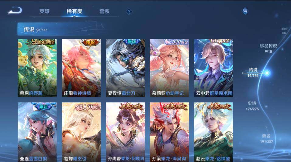 【传说皮肤】:韩信踏浪归,云缨神骥越千峰,关羽神骥镇沧海,朵莉亚神骥鸣幻洲,狄仁杰神骥赴朔漠,貂蝉神骥聚万邦,马超神骥逐星野,花木兰异界灵契,王昭君长夜焕生,杨戬纵目迁山,后羿神树通天,曹操万灵伏威,干将莫邪千山共赴,元歌诡秘之主,大司命死亡执政官,司马懿九山相柳,公孙离云诺千山,西施续相思,杨玉环星之鸣奏,后羿千劫归真,司空震愿照山河定,女娲愿照千秋盛,妲己愿照众生和,澜愿照九州拓,蔡文姬愿照福禄聚,虞姬愿照岁时盈,云缨幻光神枪,裴擒虎祥瑞亨通,嬴政玄雷天君,王昭君映山客,桑启鸣野蒿,庄周牧神诗旅,夏侯惇霜北刀,朵莉亚心动手记,云中君群星魔术团,亚连落雪白狼,貂蝉曦玄引,孙尚香乘龙问璇玑,孙策乘龙淬吴钩,赵云乘龙铭钟鼎,马超琥珀纪元,铠琥珀纪元,澜逐花归海,艾琳觅芳踪,露娜霜月吟,狄仁杰夜礼服假面,王昭君永恒水手月亮,甄姬至美化雀舞,大乔时之奇旅,云缨鹤归松栖,上官婉儿妄想奇谈,马可波罗妄想实况,东皇太一灼幽烈阳,诸葛亮鹤羽星尊,公孙离记忆之芯,夏洛特浮生妄,干将莫邪画中仙,花木兰燃星之曲,伽罗炽翼辉光,小乔山海琳琅生,曜山海苍雷引,李信山海炽霜斩,李白诗剑行,不知火舞绯月行,王昭君星穹之声,娜可露露前尘镜,马超无双飞将,大乔挚爱花嫁,露娜启示之音,孙策末日机甲,瑶时之祈愿,赵云淬星耀世,