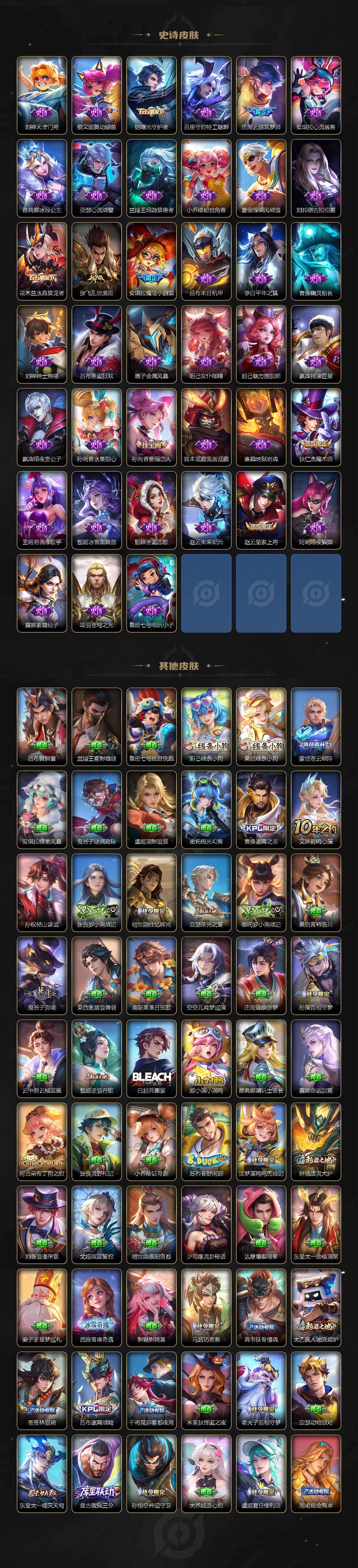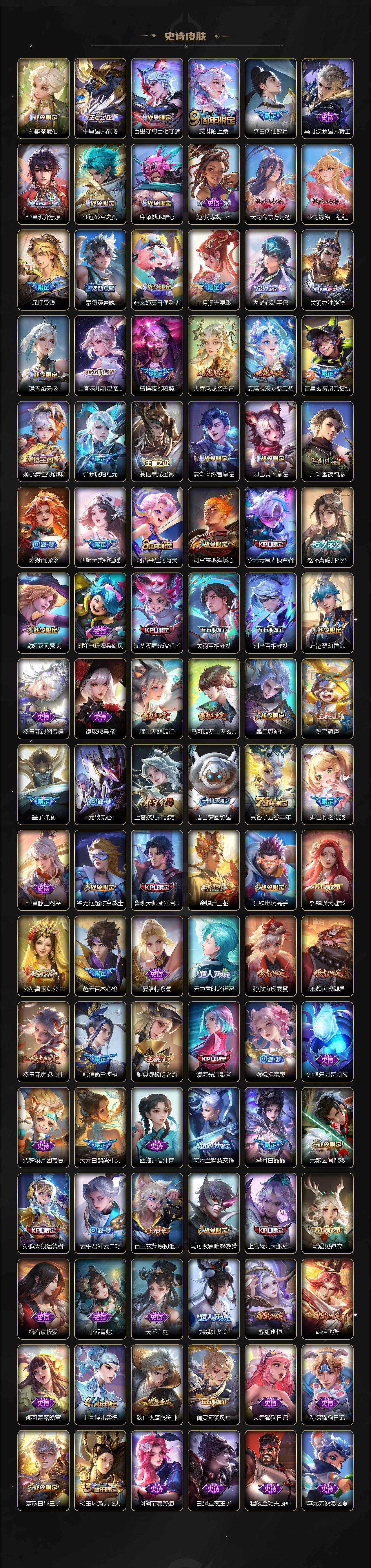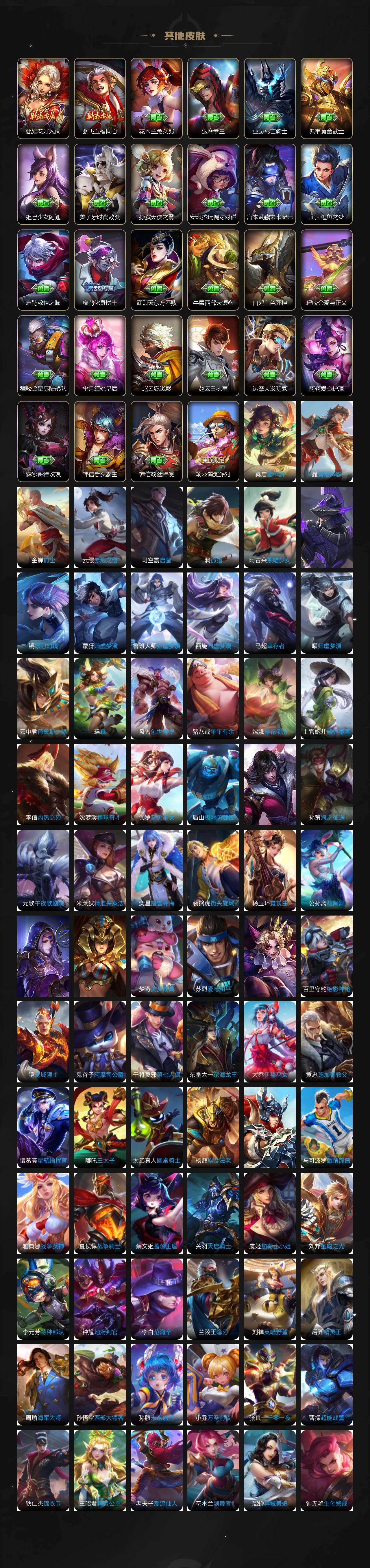 小乔青蛇,大乔白蛇,瑶遇见神鹿,娜可露露晚萤,伽罗箭羽风息,李元芳逐浪之夏,大乔猫狗日记,孙策猫狗日记,阿轲节奏热浪,露娜紫霞仙子,王昭君偶像歌手,项羽苍穹之光,阿轲暗夜猫娘,雅典娜冰冠公主,吕布末日机甲,鲁班七号电玩小子,橘右京修罗,嬴政摇滚巨星,刘禅绅士熊喵,刘禅天才门将,白起星夜王子,安琪拉心灵骇客,程咬金功夫厨神,刘邦德古拉伯爵,兰陵王暗隐猎兽者,曹操幽灵船长,宫本武藏鬼剑武藏,亚瑟心灵战警,钟馗乐园奇幻夜,蔡文姬舞动绿茵,廉颇地狱岩魂,西施诗语江南,小乔缤纷独角兽,夏侯惇乘风破浪,花木兰水晶猎龙者,铠曙光守护者,墨子金属风暴,百里玄策原初追逐者,吕布圣诞狂欢,貂蝉圣诞恋歌,百里守约特工魅影,嬴政暗夜贵公子,嫦娥拒霜思,雅典娜黎明之约,李白千年之狐,夏洛特永昼,貂蝉唤灵魅影,弈星滕王阁序,镜玫瑰异探,杨玉环银翎春语,刘备百相守梦,关羽百相守梦,沈梦溪匿光破解者,刘禅电玩·爆裂旋风,赵怀真鹤归松栖,李元芳匿光侦查者,蒙犽百解令,周瑜雪夜绮愿,高渐离燃音魔法,伽罗琥珀纪元,大乔乘龙·忆丹青,安琪拉乘龙·聚宝船,曹操夜都魔契,上官婉儿群星魔术团,关羽决胜骁骑,海诺心动手记,李白谪仙醉月,姬小满飞车小橘子,白起苍鳞隐世,赵怀真器灵·浮梦炉,亚连糖绘人间,苍狼魂孤将,狄仁杰绮世丹青