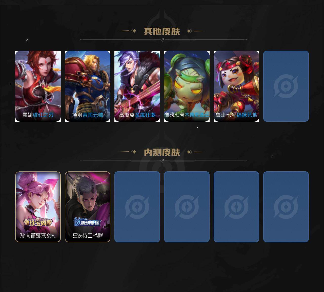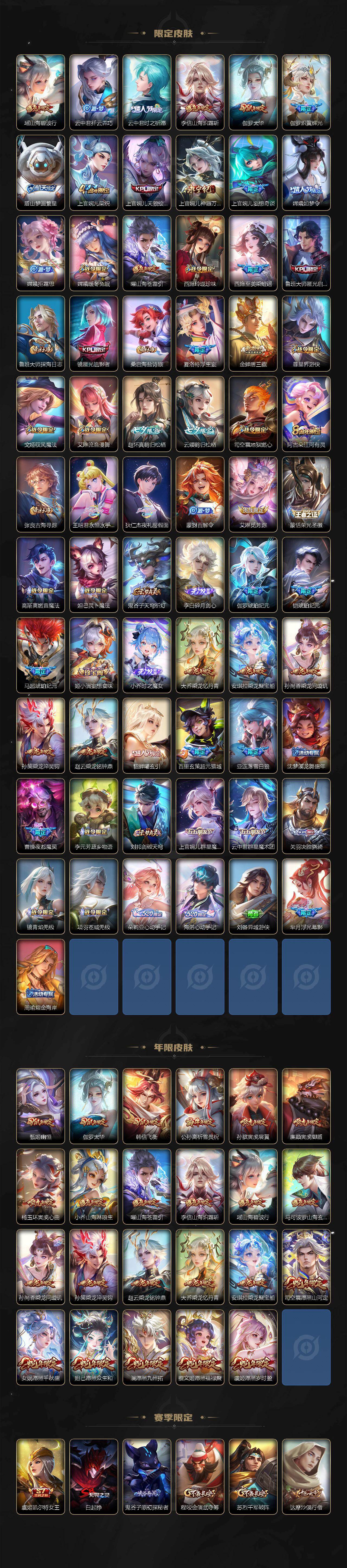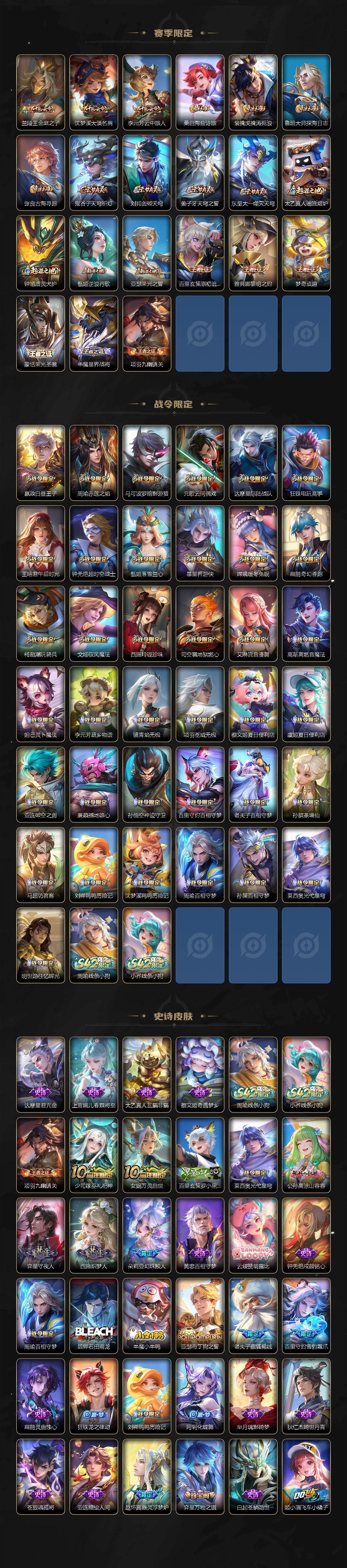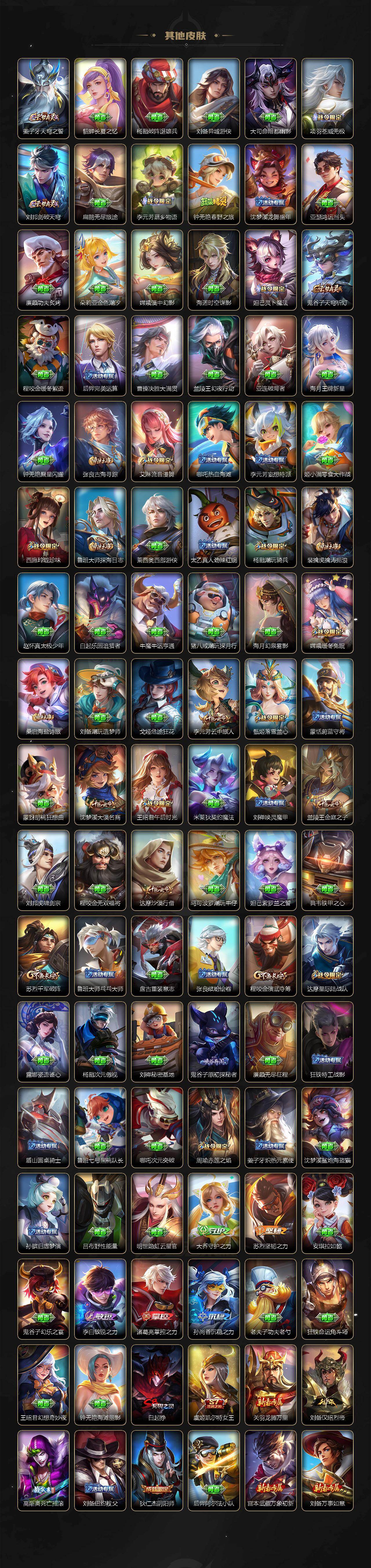 小乔青蛇,大乔白蛇,瑶遇见神鹿,娜可露露晚萤,伽罗箭羽风息,李元芳逐浪之夏,大乔猫狗日记,孙策猫狗日记,阿轲节奏热浪,露娜紫霞仙子,王昭君偶像歌手,项羽苍穹之光,阿轲暗夜猫娘,雅典娜冰冠公主,吕布末日机甲,鲁班七号电玩小子,橘右京修罗,嬴政摇滚巨星,刘禅绅士熊喵,刘禅天才门将,白起星夜王子,安琪拉心灵骇客,程咬金功夫厨神,刘邦德古拉伯爵,兰陵王暗隐猎兽者,曹操幽灵船长,宫本武藏鬼剑武藏,亚瑟心灵战警,钟馗乐园奇幻夜,蔡文姬舞动绿茵,廉颇地狱岩魂,西施诗语江南,小乔缤纷独角兽,夏侯惇乘风破浪,花木兰水晶猎龙者,铠曙光守护者,墨子金属风暴,百里玄策原初追逐者,吕布圣诞狂欢,貂蝉圣诞恋歌,百里守约特工魅影,嬴政暗夜贵公子,嫦娥拒霜思,雅典娜黎明之约,李白千年之狐,夏洛特永昼,貂蝉唤灵魅影,弈星滕王阁序,镜玫瑰异探,杨玉环银翎春语,刘备百相守梦,关羽百相守梦,沈梦溪匿光破解者,刘禅电玩·爆裂旋风,赵怀真鹤归松栖,李元芳匿光侦查者,蒙犽百解令,周瑜雪夜绮愿,高渐离燃音魔法,伽罗琥珀纪元,大乔乘龙·忆丹青,安琪拉乘龙·聚宝船,曹操夜都魔契,上官婉儿群星魔术团,关羽决胜骁骑,海诺心动手记,李白谪仙醉月,姬小满飞车小橘子,白起苍鳞隐世,赵怀真器灵·浮梦炉,亚连糖绘人间,苍狼魂孤将,狄仁杰绮世丹青