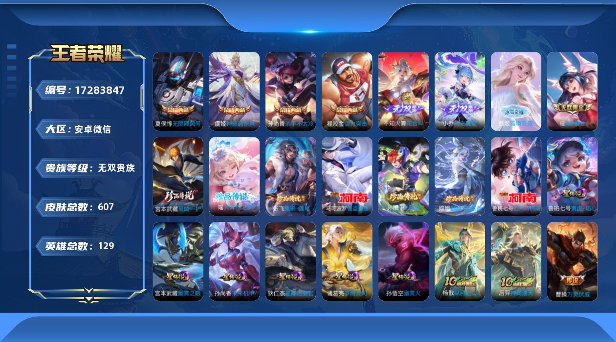 [17283847]87个性按键-安卓WX-V11-最强王者段位-129英雄-607皮肤-4典藏皮肤-1典藏英雄-4无双-7珍品传说-1天幕-6星传说-78传说-217史诗