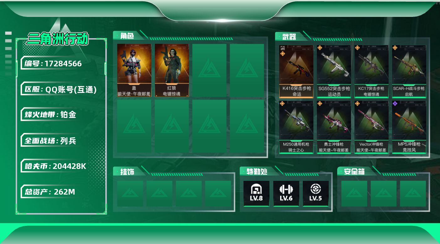 [17284566]【店主推荐捡漏号!可直接换绑】204428k哈伏币-234m流动资产-58烽火等级-铂金-17战场等级-列兵 【干员外观】:蛊-能天使午夜邮差,红狼-电锯惊魂 【近战皮肤】:近战-黑鹰 【典藏外观】:K416突击步枪-命运 【传说级普通外观】:SG552突击步枪-运动员,SCAR-H战斗步枪-启航,KC17突击步枪-电锯惊魂,Vector冲锋枪-能天使-午夜邮差,勇士冲锋枪-能天使-午夜邮差,M250通用机枪-骑士之心 【史诗级普通外观】:ASh-12战斗步枪-无极限,G3战斗步枪-流沙送葬,AS Val突击步枪-百步穿杨,腾龙突击步枪-猎鳄行动,K437突击步枪-守护者,MP5冲锋枪-战术竞备,MP5冲锋枪-竞技风,MP7冲锋枪-守护者,M250通用机枪-囚徒,Mini-14射手步枪-守护者,SV-98狙击步枪-林中猎手,M700狙击步枪-蝮蛇,AWM狙击步枪-无极限,复合弓-守护者 【稀有级普通外观】:M4A1突击步枪-零点,AKM突击步枪-战术演练,AKM突击步枪-肃杀,QBZ95-1突击步枪-公平竞技,ASh-12战斗步枪-繁盛,K416突击步枪-碳纤维,M7战斗步枪-捣蛋鬼,AK-12突击步枪-零点,SCAR-H战斗步枪-荣耀列队,SCAR-H战斗步枪-黄昏,G3战斗步枪-战术演练,G3战斗步枪-主宰,腾龙突击步枪-冰天雪地,MP5冲锋枪-弄臣,MP5冲锋枪-哈夫克卫队,P90冲锋枪-黄昏,P90冲锋枪-捣蛋鬼,UZI冲锋枪-亚特兰蒂斯,SMG-45-行动开启,SMG-45冲锋枪-幻影结构,SMG-45冲锋枪-天网,勇士冲锋枪-主宰,勇士冲锋枪-冰天雪地,M1014霰弹枪-幻影结构,S12K霰弹枪-战术演练,QJB201轻机枪-黄昏,QJB201轻机枪-哈夫克卫队,Mini-14射手步枪-荣耀列队,SVD狙击步枪-战术行动,SKS射手步枪-弄臣,SR-25射手步枪-开拓,G18-星链科技,G18-哈夫克航天 【普通级普通外观】:M4A1突击步枪-粉色涂装,M4A1突击步枪-海色,QBZ95-1突击步枪-高雅黑,QBZ95-1突击步枪-海浪,QBZ95-1突击步枪-三角洲力量,QBZ95-1突击步枪-海色,K416突击步枪-几何迷彩,K416突击步枪-高雅黑,M16A4突击步枪-三角洲力量,M16A4突击步枪-山林猎人,M16A4突击步枪-高雅黑,AUG突
