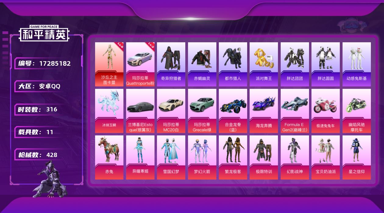 [17285182]安卓 手Q-无敌战神框-1神装-39粉装-25特效枪-11载具-19粉色飞行器-169120热力值-21王牌印记-316套装-428枪皮