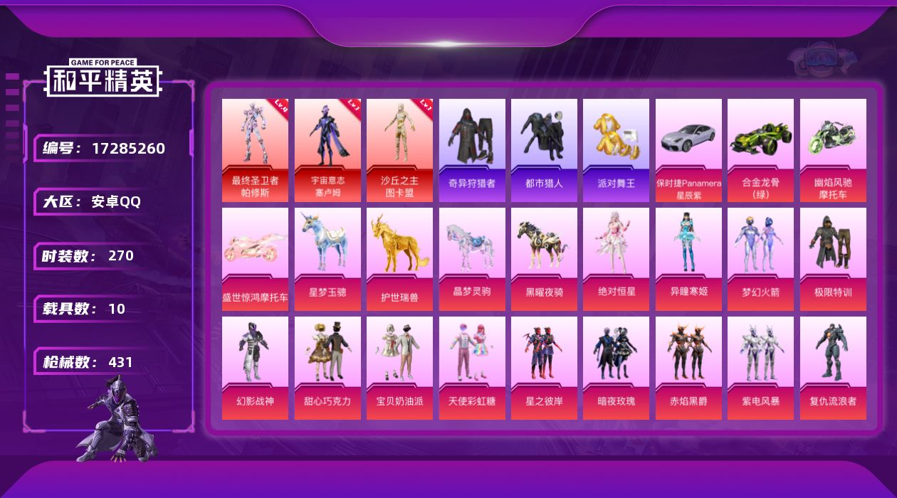 [17285260]安卓 手Q-4神装-30粉装-34特效枪-10载具-23粉色飞行器-163042热力值-18王牌印记-270套装-431枪皮