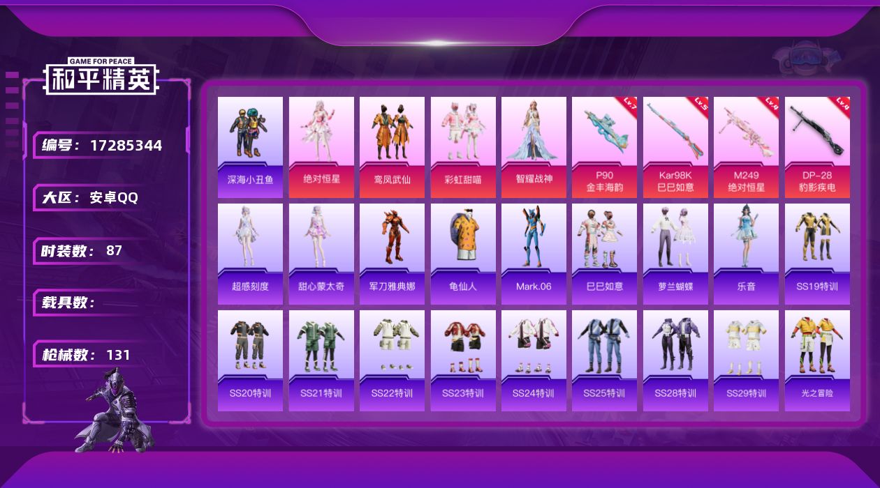 [17285344]安卓 手Q-4粉装-6特效枪-0载具-1粉色飞行器-38832热力值-3王牌印记-87套装-131枪皮 【热门品类】:套装-深海小丑鱼,角色-军刀雅典娜,套装-龟仙人,角色-Mark.06 【粉色套装】:角色-绝对恒星,粉装-鸾凤武仙,粉装-彩虹甜喵,角色-智耀战神 【粉色枪皮等级】:P90-金丰海韵(七级),Kar98K-巳巳如意(五级),Mk14-福马献瑞(四级),AA12-G-萌骑幻想(一级),M249-绝对恒星(四级),DP-28-豹影疾电(四级) 【粉色枪皮】:P90-金丰海韵,Kar98K-巳巳如意,Mk14-福马献瑞,AA12-G-萌骑幻想,M249-绝对恒星,DP-28-豹影疾电 【粉色飞行器】:绝对恒星飞行器 【粉色降落伞】:绝对恒星降落伞,洛神天依降落伞,幻梦音符降落伞,橘柚倾心降落伞,垂柳戏鸭降落伞,旋转彩虹降落伞,暗夜鎏金降落伞,守护天翼降落伞 【稀有套装】:套装-龟仙人,套装-巳巳如意,角色-超感刻度,角色-甜心蒙太奇,套装-雪国风尚,套装-萝兰蝴蝶,角色-乐音 【稀有枪皮】:AKM-彩虹符号,AKM-恐龙拽拽,AKM-破晓战魂,AKM-缤纷海域,AKM-龙的传人,M16A4-幻世战舞者,M16A4-甜心亚梦,SCAR-L-炫彩节奏,SCAR-L-玉兔迎春,SCAR-L-红色方程式,M416-糯团青竹,M416-绯红前夜,M416-蓝色火焰,GROZA-异彩先驱,GROZA-田园牧歌,AUG-天降萌叽,AUG-耀粉歌者,AUG-绝对恒星,QBZ-彩虹符号,QBZ-飞驰魅影,M762-天降萌叽,M762-绒雪飘舞,G36C-青丘仙客,G36C-星穹咏叹调,AC-VAL-天降萌叽,AC-VAL-甜心亚梦,蜜獾-天降萌叽,蜜獾-娇憨猪猪,UZI-啾咪啾咪,UZI-天降萌叽,UZI-娇憨猪猪,UMP45-夜灯,UMP45-时空追击者,UMP45-生命誓言,UMP45-蓝色火焰,Vector-田园牧歌,汤姆逊-天降萌叽,汤姆逊-奇异狩猎者,汤姆逊-耀粉歌者,P90-飞驰魅影,Kar98K-洛神天依,Kar98K-飞驰魅影,M24-炫彩节奏,SKS-炫彩节奏,VSS-田园牧歌,Mini14-梦幻火箭,Mini14-筑梦精灵,Mini14-耀粉歌者,SLR-娇憨猪猪,莫辛纳甘-炙焰牛王,S686-生命誓言,S686-红色方程式,S1897-星夜魔法师,