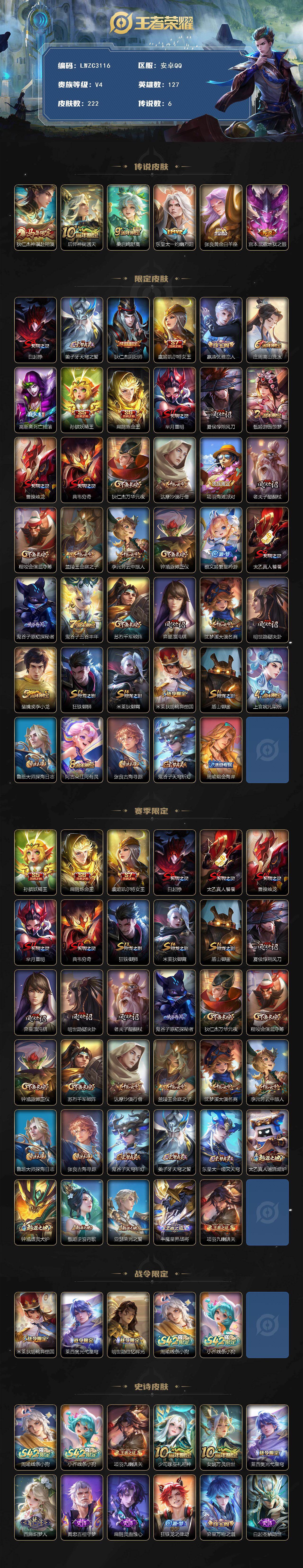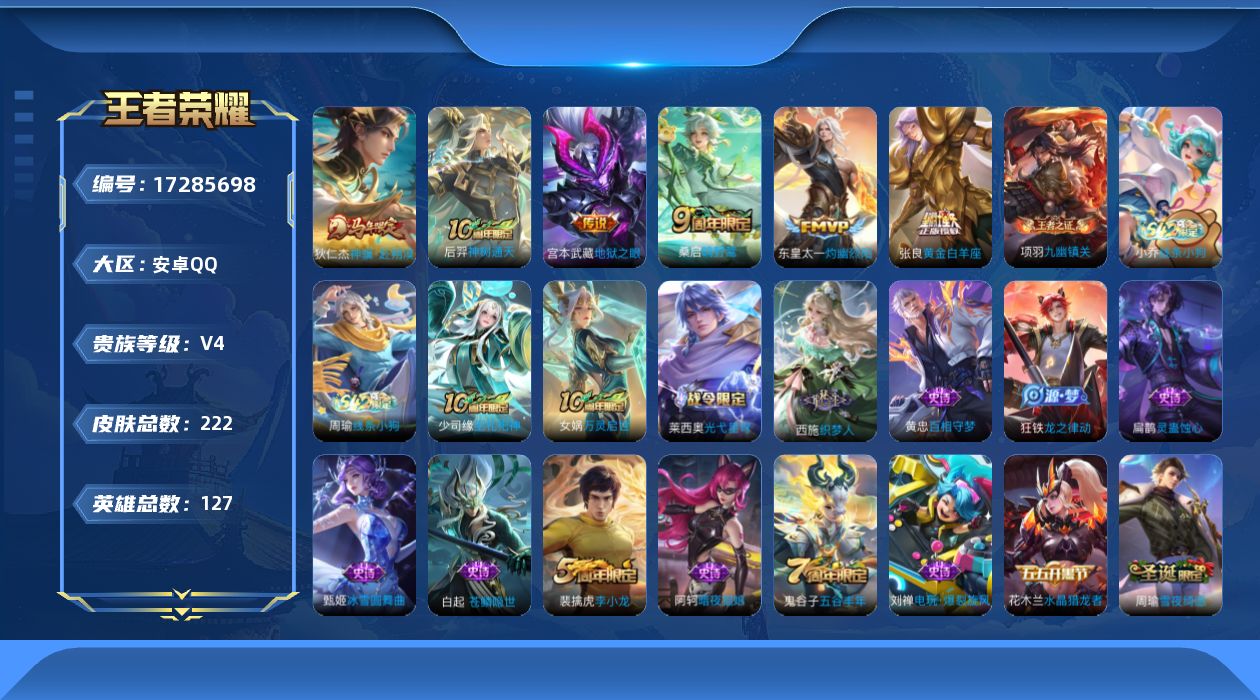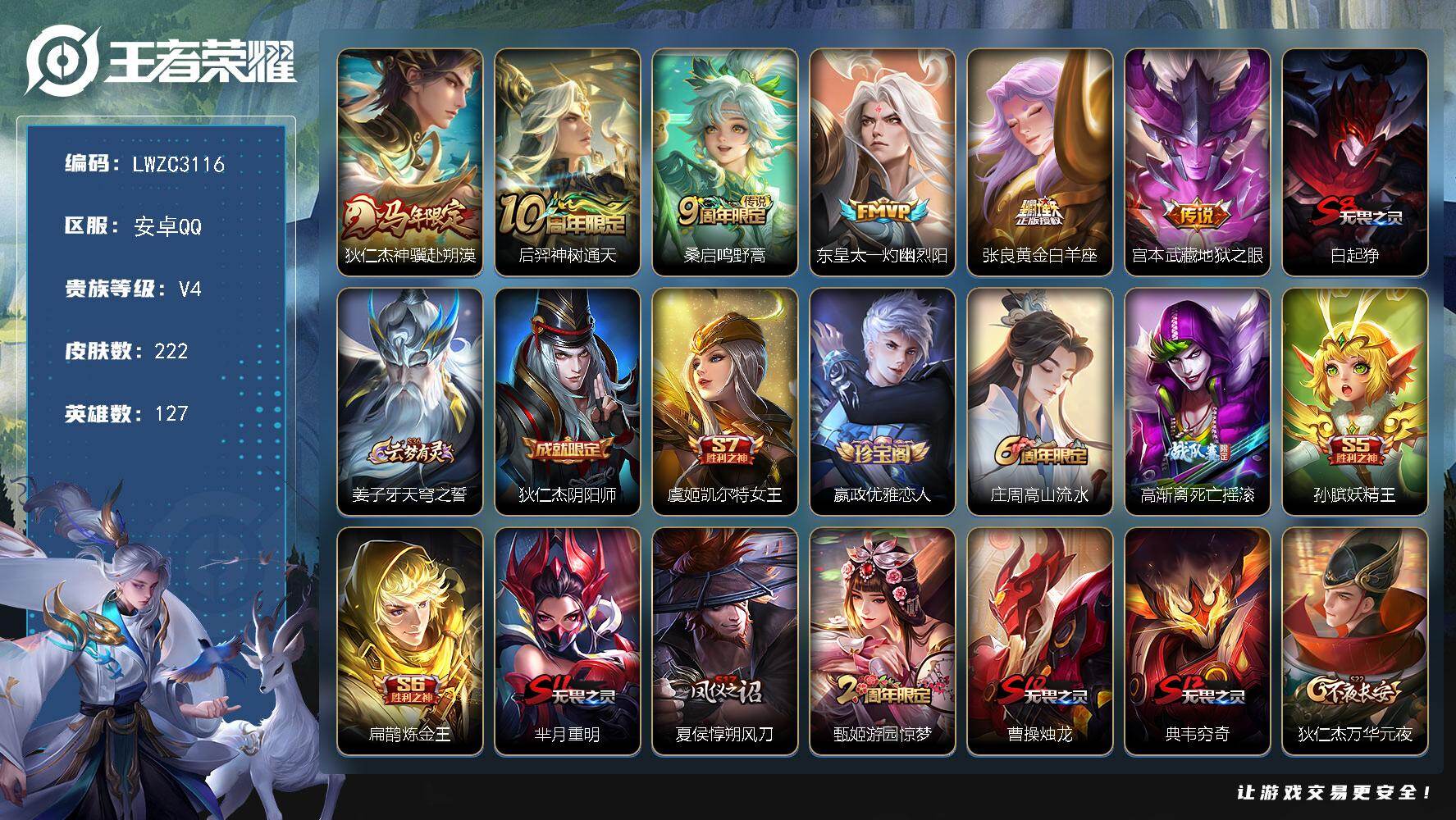 [17285698]【特价急出/详情看图】安卓Q-V4-最强王者段位-127英雄-222皮肤-6传说-56史诗