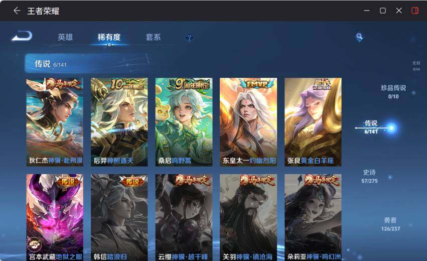 【传说皮肤】:狄仁杰神骥赴朔漠,后羿神树通天,桑启鸣野蒿,东皇太一灼幽烈阳,张良黄金白羊座,宫本武藏地狱之眼