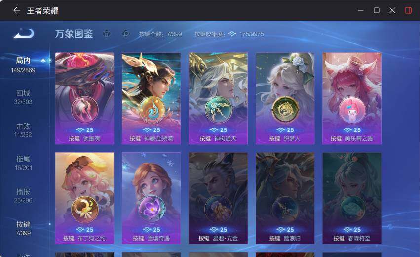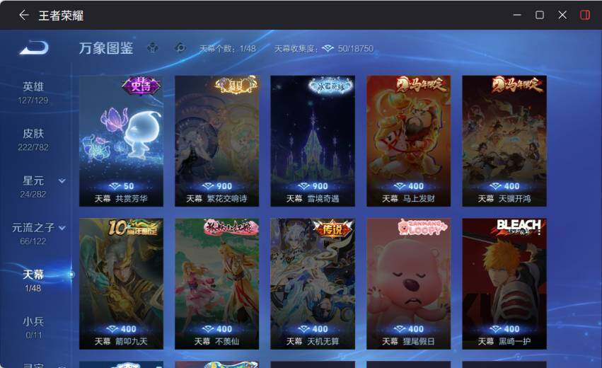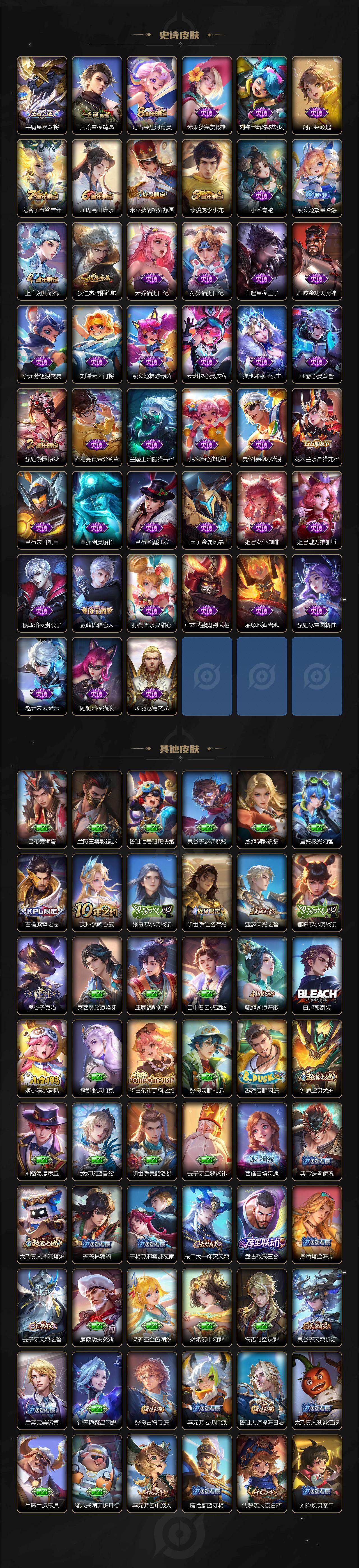 【史诗皮肤】:周瑜线条小狗,小乔线条小狗,项羽九幽镇关,少司缘巫礼祀神,女娲万灵启世,莱西奥光弋星穹,西施织梦人,黄忠百相守梦,扁鹊灵蛊蚀心,狂铁龙之律动,弈星万物之道,白起苍鳞隐世,牛魔星界战将,周瑜雪夜绮愿,阿古朵江河有灵,米莱狄完美假期,刘禅电玩爆裂旋风,阿古朵顽趣,鬼谷子五谷丰年,庄周高山流水,米莱狄胡桃异想国,裴擒虎李小龙,小乔青蛇,蔡文姬繁星吟游,上官婉儿梁祝,狄仁杰鹰眼统帅,大乔猫狗日记,孙策猫狗日记,白起星夜王子,程咬金功夫厨神,李元芳逐浪之夏,刘禅天才门将,蔡文姬舞动绿茵,安琪拉心灵骇客,雅典娜冰冠公主,亚瑟心灵战警,甄姬游园惊梦,诸葛亮黄金分割率,兰