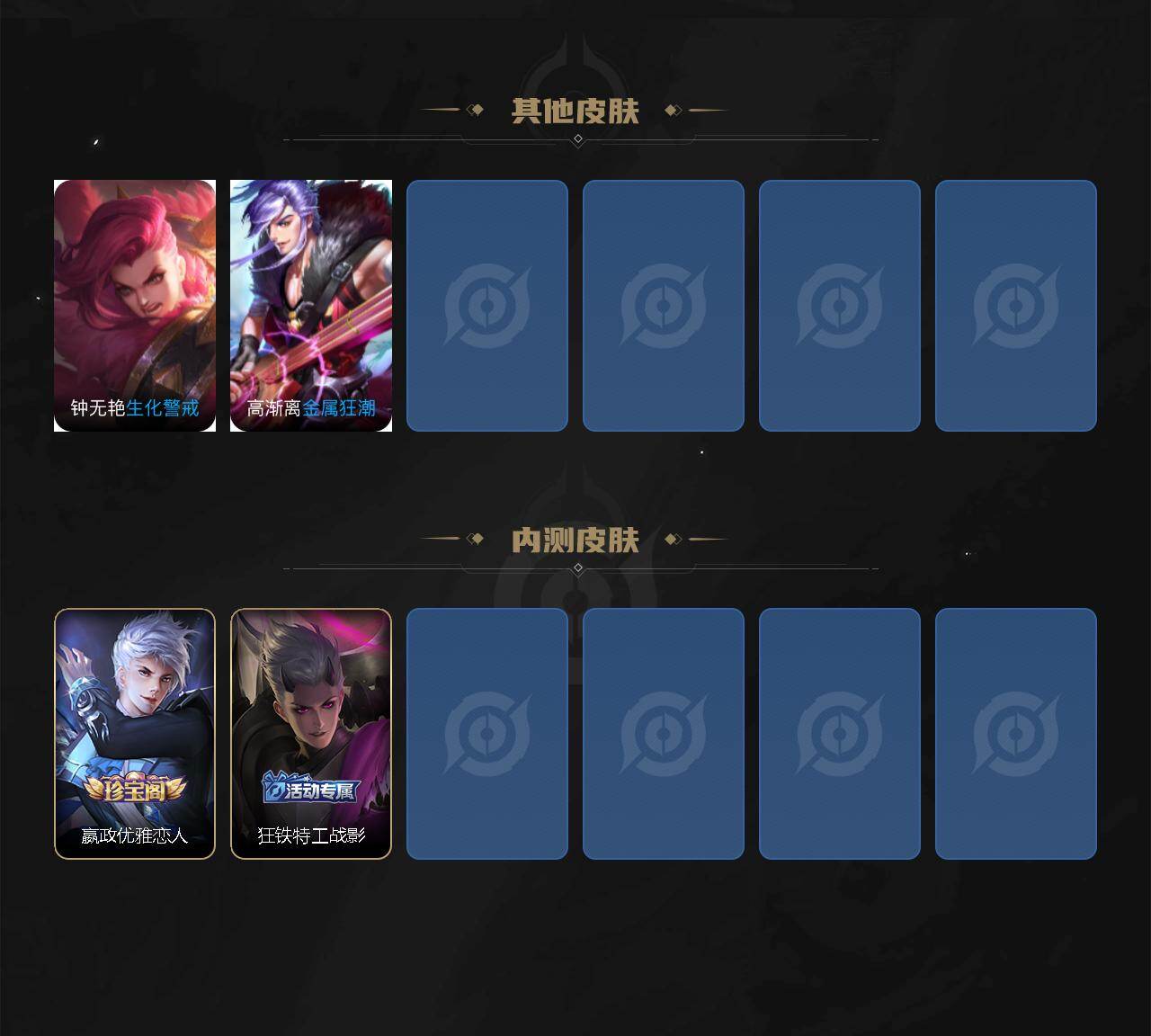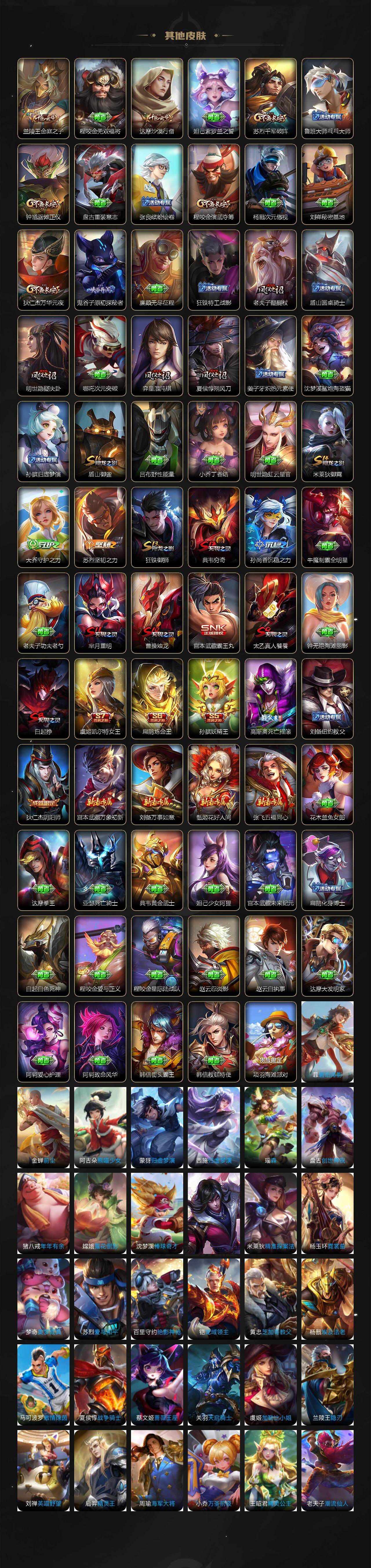 【限定皮肤】:白起狰,姜子牙天穹之誓,狄仁杰阴阳师,虞姬凯尔特女王,嬴政优雅恋人,庄周高山流水,高渐离死亡摇滚,孙膑妖精王,扁鹊炼金王,芈月重明,夏侯惇朔风刀,甄姬游园惊梦,曹操烛龙,典韦穷奇,狄仁杰万华元夜,达摩沙漠行僧,项羽海滩派对,老夫子醍醐杖,程咬金演武夺筹,兰陵王金庭之子,李元芳云中旅人,钟馗驱傩正仪,蔡文姬繁星吟游,太乙真人饕餮,鬼谷子原初探秘者,鬼谷子五谷丰年,苏烈千军破阵,弈星混沌棋,沈梦溪大漠名商,明世隐疑决卦,裴擒虎李小龙,狂铁御狮,米莱狄御霄,米莱狄胡桃异想国,盾山御銮,上官婉儿梁祝,鲁班大师探海日志,阿古朵江河有灵,张良古海寻踪,鬼谷子天穹祈灯,周瑜熔金海岸