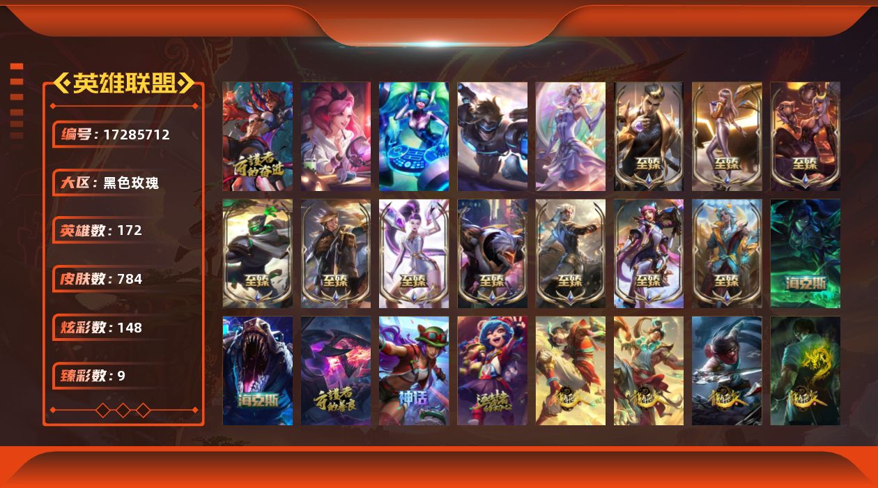 [17285712]172英雄-784皮肤-148炫彩-7终极-16神话-163限定-79传说-127史诗