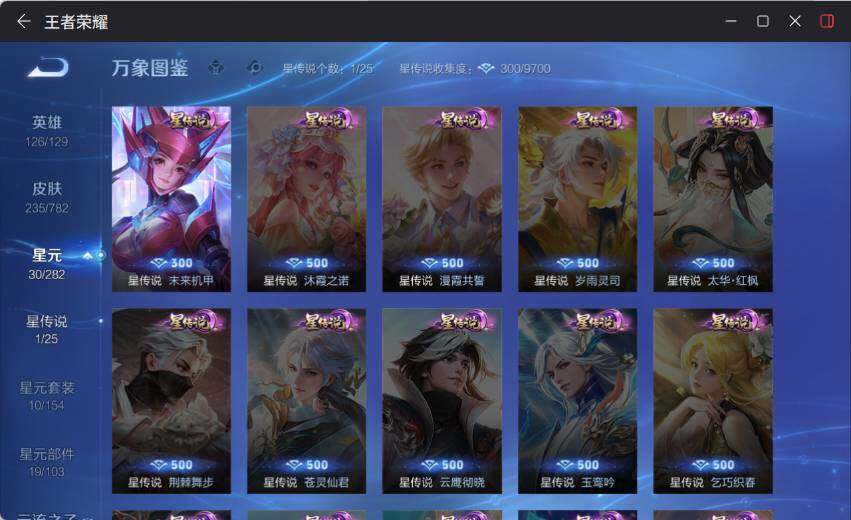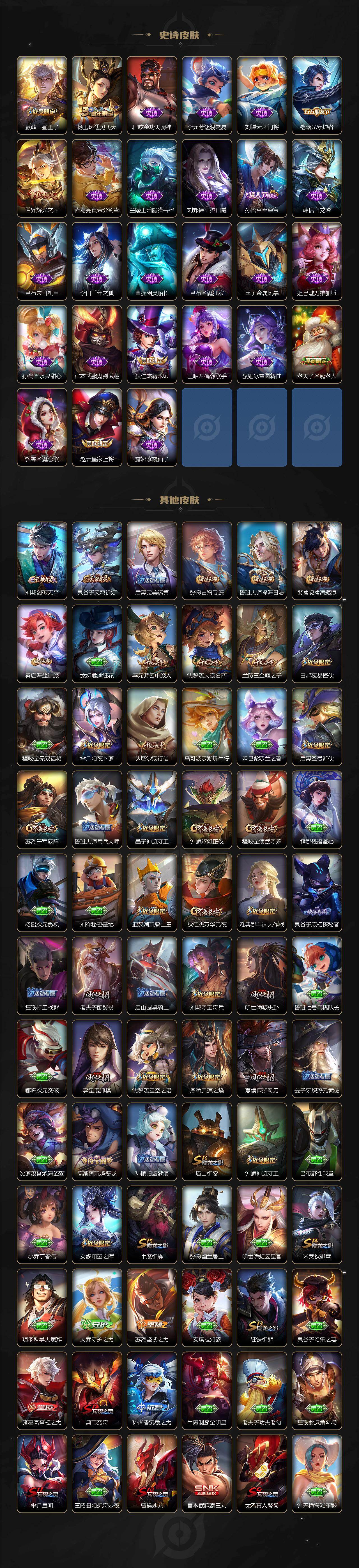 亚瑟狮心王,庄周蜃楼王,孙膑妖精王,扁鹊炼金王,虞姬凯尔特女王,白起狰,太乙真人饕餮,曹操烛龙,芈月重明,典韦穷奇,狂铁御狮,米莱狄御霄,牛魔御旌,盾山御銮,夏侯惇朔风刀,明世隐疑决卦,老夫子醍醐杖,鬼谷子原初探秘者,狄仁杰万华元夜,程咬金演武夺筹,钟馗驱傩正仪,苏烈千军破阵,嬴政白昼王子,女娲朔望之晖,典韦蓝屏警告,钟馗神迹守卫,鲁班七号狮舞东方,沈梦溪星空之诺,李元芳银河之约,刘邦夺宝奇兵,元歌云间偶戏,弈星混沌棋,达摩沙漠行僧,兰陵王金庭之子,沈梦溪大漠名商,李元芳云中旅人,桑启海盐诗旅,裴擒虎擒涛扼浪,鲁班大师探海日志,张良古海寻踪