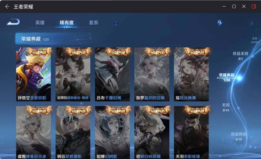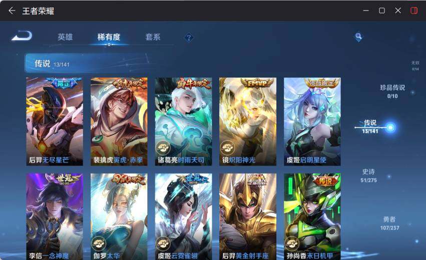 【传说皮肤】:后羿无尽星芒,裴擒虎寅虎赤拳,诸葛亮时雨天司,镜炽阳神光,虞姬启明星使,李信一念神魔,伽罗太华,虞姬云霓雀翎,后羿黄金射手座,孙尚香末日机甲,孙悟空地狱火,吕布天魔缭乱,狄仁杰超时空战士