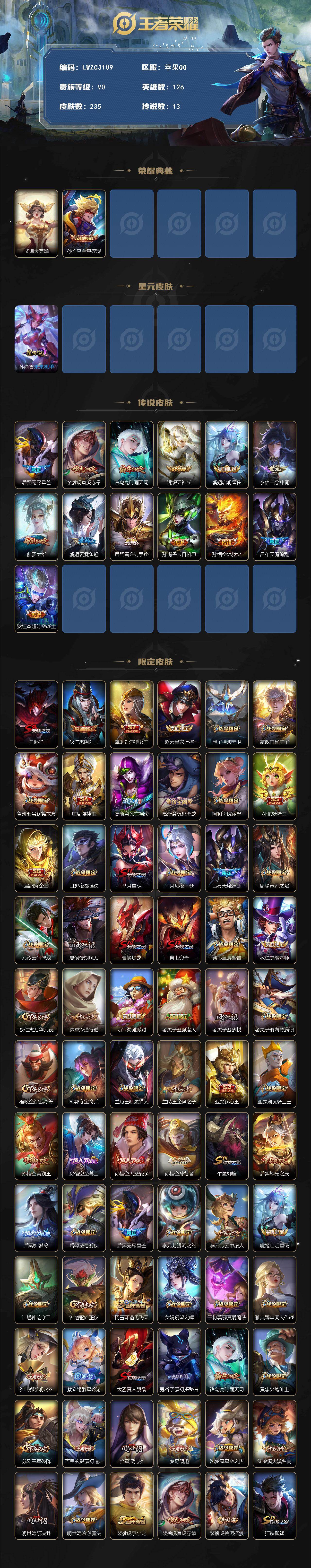 [17285591]可二次【特价出售/店主推荐/1省标/1市标】:苹果Q-V8-尊贵铂金III段位-126英雄-235皮肤-1典藏皮肤-1典藏英雄-1星元-13传说-51史诗 【荣耀典藏】:武则天英雄,孙悟空全息碎影 【传说皮肤】:后羿无尽星芒,裴擒虎寅虎赤拳,诸葛亮时雨天司,镜炽阳神光,虞姬启明星使,李信一念神魔,伽罗太华,虞姬云霓雀翎,后羿黄金射手座,孙尚香末日机甲,孙悟空地狱火,吕布天魔缭乱,狄仁杰超时空战士 【限定皮肤】:白起狰,狄仁杰阴阳师,虞姬凯尔特女王,赵云皇家上将,墨子神迹守卫,嬴政白昼王子,鲁班七号狮舞东方,庄周蜃楼王,高渐离死亡摇滚,高渐离玩趣恶龙,阿轲迷踪丽影,孙膑妖精王,扁鹊炼金王,白起夜都怪侠,芈月重明,芈月幻夜卜梦,吕布天魔缭乱,周瑜赤莲之焰,元歌云间偶戏,夏侯惇朔风刀,曹操烛龙,典韦穷奇,典韦蓝屏警告,狄仁杰魔术师,狄仁杰万华元夜,达摩沙漠行僧,项羽海滩派对,老夫子圣诞老人,老夫子醍醐杖,老夫子航海奇遇记,程咬金演武夺筹,刘邦夺宝奇兵,兰陵王驯魔猎人,兰陵王金庭之子,亚瑟狮心王,亚瑟潮玩骑士王,孙悟空美猴王,孙悟空至尊宝,孙悟空大圣娶亲,孙悟空孙行者,牛魔御旌,后羿辉光之辰,后羿如梦令,后羿圣弓游侠,后羿无尽星芒,李元芳银河之约,李元芳云中旅人,虞姬启明星使,钟馗神迹守卫,钟馗驱傩正仪,杨玉环遇见飞天,女娲朔望之晖,干将莫邪真爱魔法,雅典娜单词大作战,雅典娜黎明之约,蔡文姬繁星吟游,太乙真人饕餮,鬼谷子原初探秘者,诸葛亮时雨天司,黄忠火炮绅士,苏烈千军破阵,百里玄策原初追逐者,弈星混沌棋,梦奇顽趣,沈梦溪星空之诺,沈梦溪大漠名商,明世隐疑决卦,明世隐吟游魔法,裴擒虎李小龙,裴擒虎寅虎赤拳,裴擒虎擒涛扼浪,狂铁御狮,米莱狄御霄,伽罗太华,盾山御銮,上官婉儿梁祝,嫦娥拒霜思,鲁班大师探海日志,桑启海盐诗旅,张良古海寻踪,鬼谷子天穹祈灯,刘邦剑破天穹 【年限皮肤】:孙悟空美猴王,后羿辉光之辰,伽罗太华,诸葛亮时雨天司,裴擒虎寅虎赤拳 【赛季限定】:亚瑟狮心王,庄周蜃楼王,孙膑妖精王,扁鹊炼金王,虞姬凯尔特女王,白起狰,太乙真人饕餮,曹操烛龙,芈月重明,典韦穷奇,狂铁御狮,米莱狄御霄,牛魔御旌,盾山御銮,夏侯惇朔风刀,弈星混沌棋,明世隐疑决卦,老夫子醍醐杖,鬼谷子原初探秘者,狄仁杰万华元夜,程咬金演武夺筹,钟馗驱傩正仪,苏烈千军破阵,达摩沙漠行僧,兰陵王金庭之子