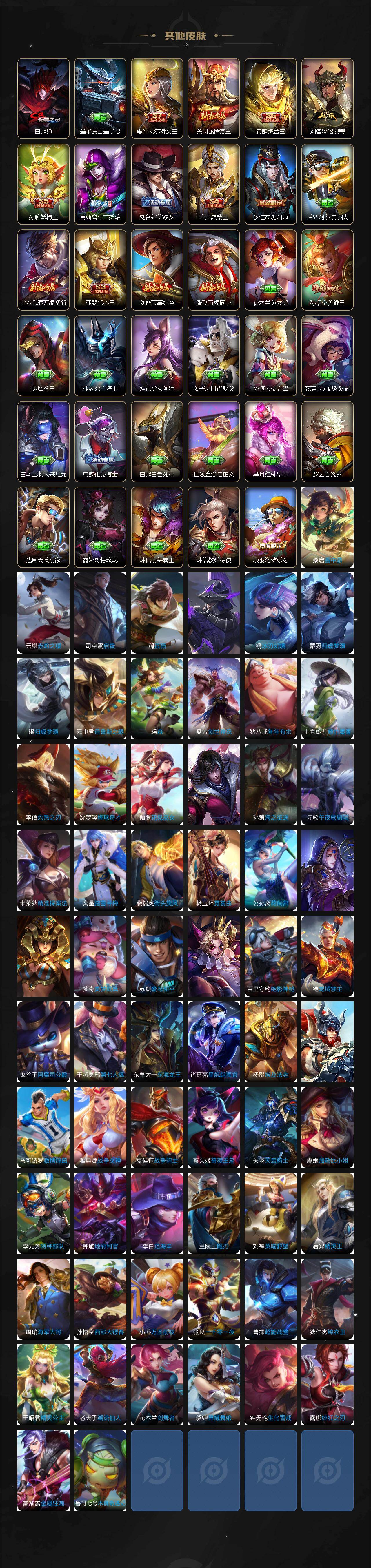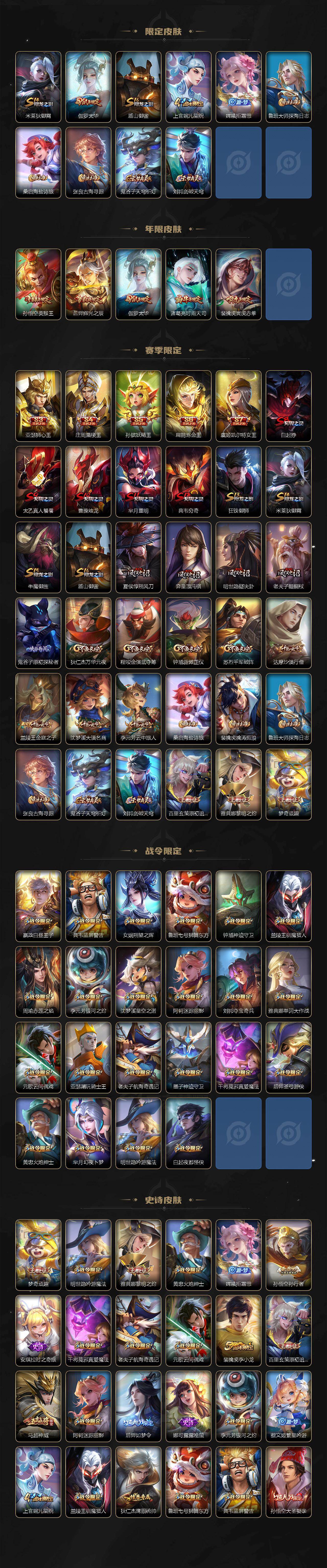 【限定皮肤】:白起狰,狄仁杰阴阳师,虞姬凯尔特女王,赵云皇家上将,墨子神迹守卫,嬴政白昼王子,鲁班七号狮舞东方,庄周蜃楼王,高渐离死亡摇滚,高渐离玩趣恶龙,阿轲迷踪丽影,孙膑妖精王,扁鹊炼金王,白起夜都怪侠,芈月重明,芈月幻夜卜梦,吕布天魔缭乱,周瑜赤莲之焰,元歌云间偶戏,夏侯惇朔风刀,曹操烛龙,典韦穷奇,典韦蓝屏警告,狄仁杰魔术师,狄仁杰万华元夜,达摩沙漠行僧,项羽海滩派对,老夫子圣诞老人,老夫子醍醐杖,老夫子航海奇遇记,程咬金演武夺筹,刘邦夺宝奇兵,兰陵王驯魔猎人,兰陵王金庭之子,亚瑟狮心王,亚瑟潮玩骑士王,孙悟空美猴王,孙悟空至尊宝,孙悟空大圣娶亲,孙悟空孙行者,牛魔御旌,后羿辉光之辰,后羿如梦令,后羿圣弓游侠,后羿无尽星芒,李元芳银河之约,李元芳云中旅人,虞姬启明星使,钟馗神迹守卫,钟馗驱傩正仪,杨玉环遇见飞天,女娲朔望之晖,干将莫邪真爱魔法,雅典娜单词大作战,雅典娜黎明之约,蔡文姬繁星吟游,太乙真人饕餮,鬼谷子原初探秘者,诸葛亮时雨天司,黄忠火炮绅士,苏烈千军破阵,百里玄策原初追逐者,弈星混沌棋,梦奇顽趣,沈梦溪星空之诺,沈梦溪大漠名商,明世隐疑决卦,明世隐吟游魔法,裴擒虎李小龙,裴擒虎寅虎赤拳,裴擒虎擒涛扼浪,狂铁御狮,米莱狄御霄,伽罗太华,盾山御銮,上官婉儿梁祝,嫦娥拒霜思,鲁班大师探海日志,桑启海盐诗旅,张良古海寻踪,鬼谷子天穹祈灯,刘邦剑破天穹