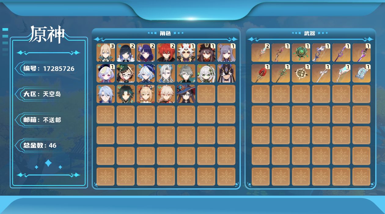 [17285726]59级/46黄/女主/20个五星角色/12个五星武器