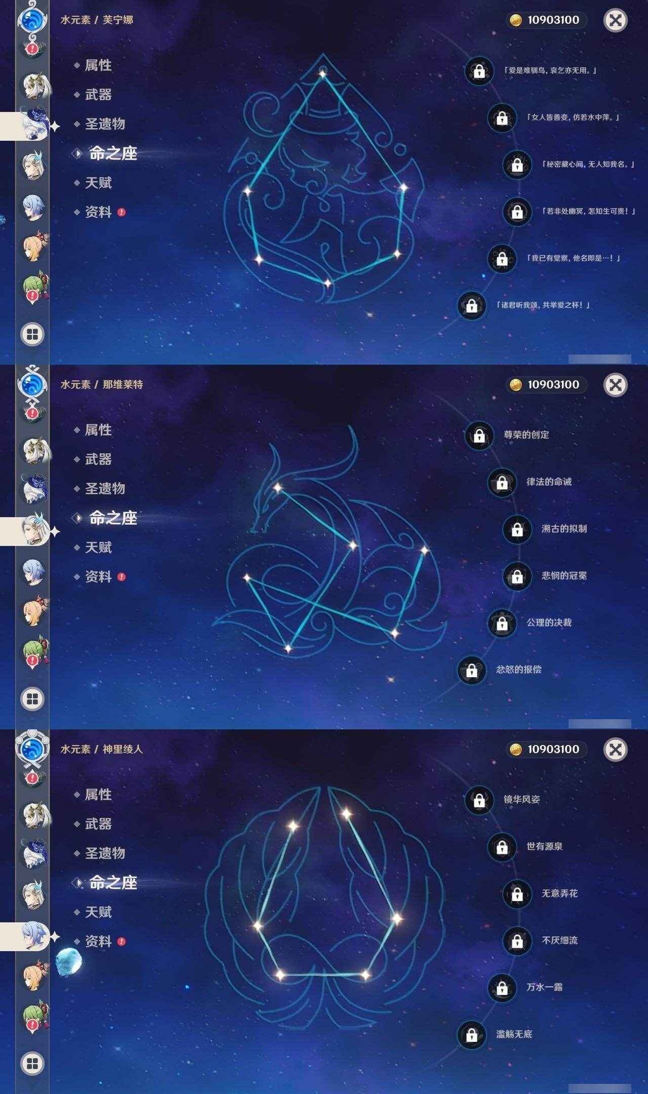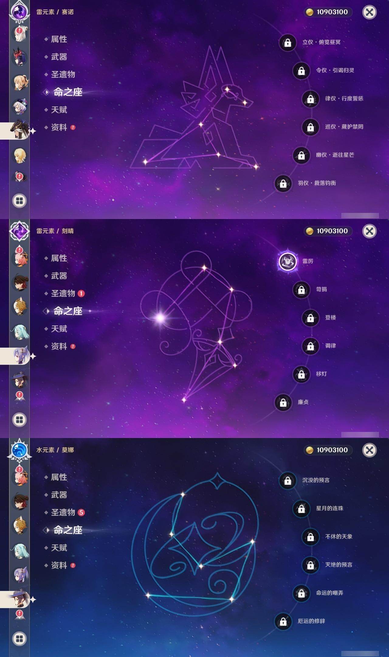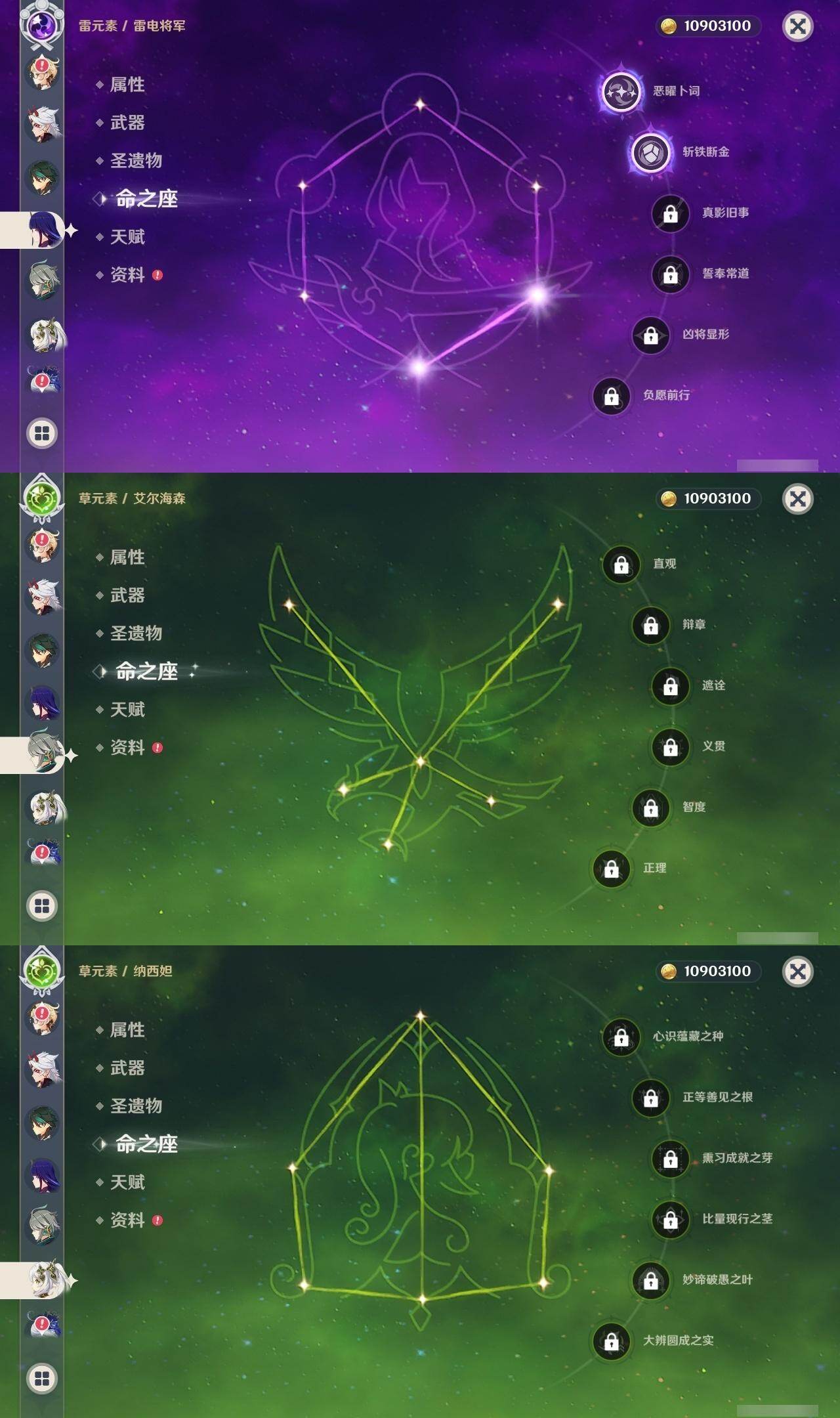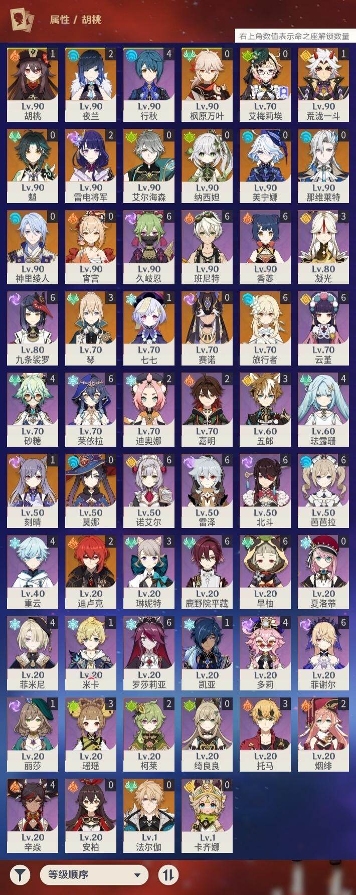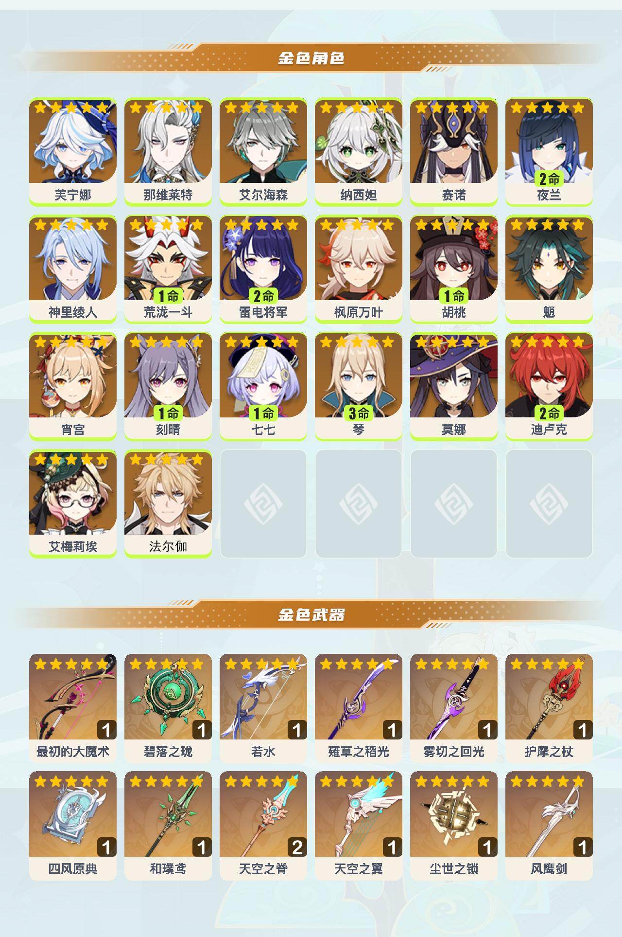 0命芙宁娜,0命那维莱特,0命艾尔海森,0命纳西妲,0命赛诺,2命夜兰,0命神里绫人,1命荒泷一斗,2命雷电将军,0命枫原万叶,1命胡桃,0命魈,0命宵宫,1命刻晴,1命七七,3命琴,0命莫娜,2命迪卢克,0命艾梅莉埃,0命法尔伽,精1最初的大魔术,精1碧落之珑,精1若水,精1薙草之稻光,精1雾切之回光,精1护摩之杖,精1四风原典,精1和璞鸢,精2天空之脊,精1天空之翼,精1尘世之锁,精1风鹰剑