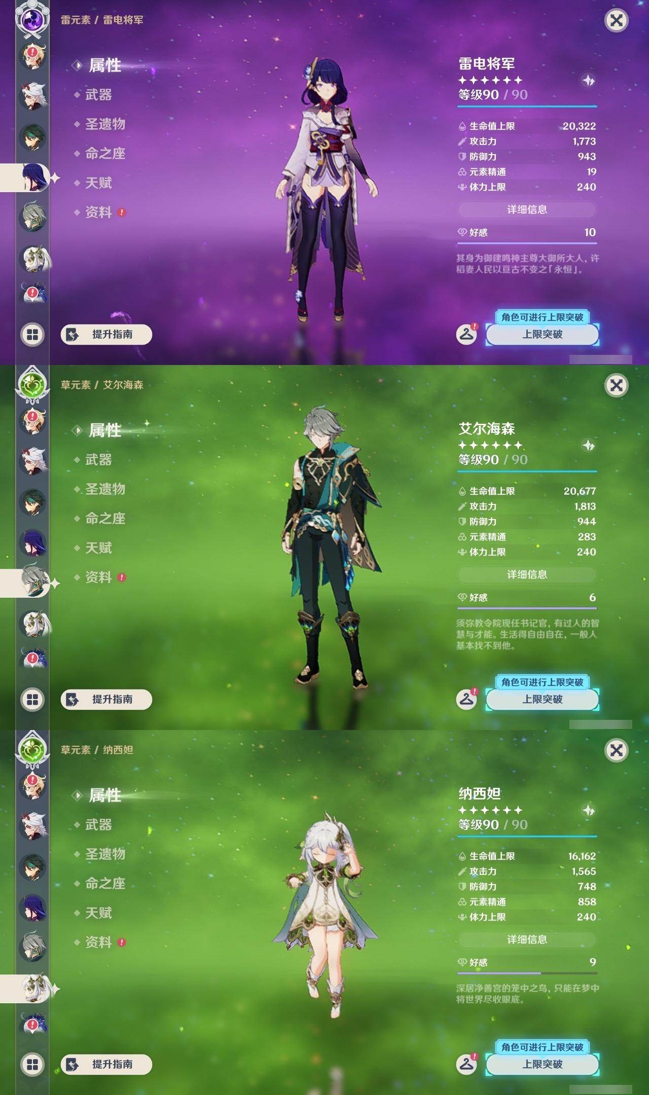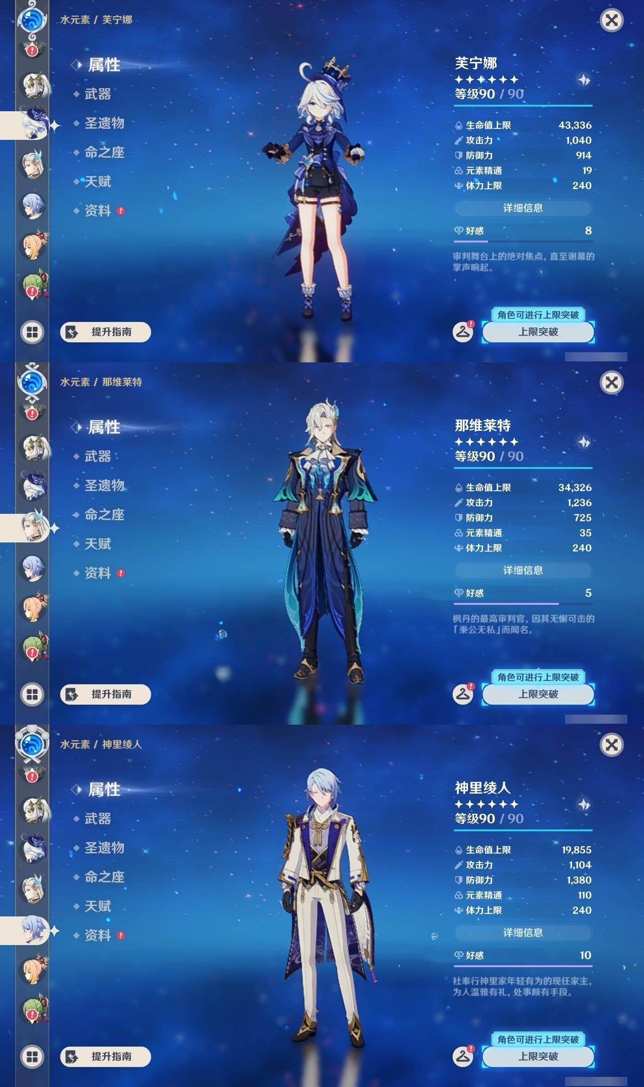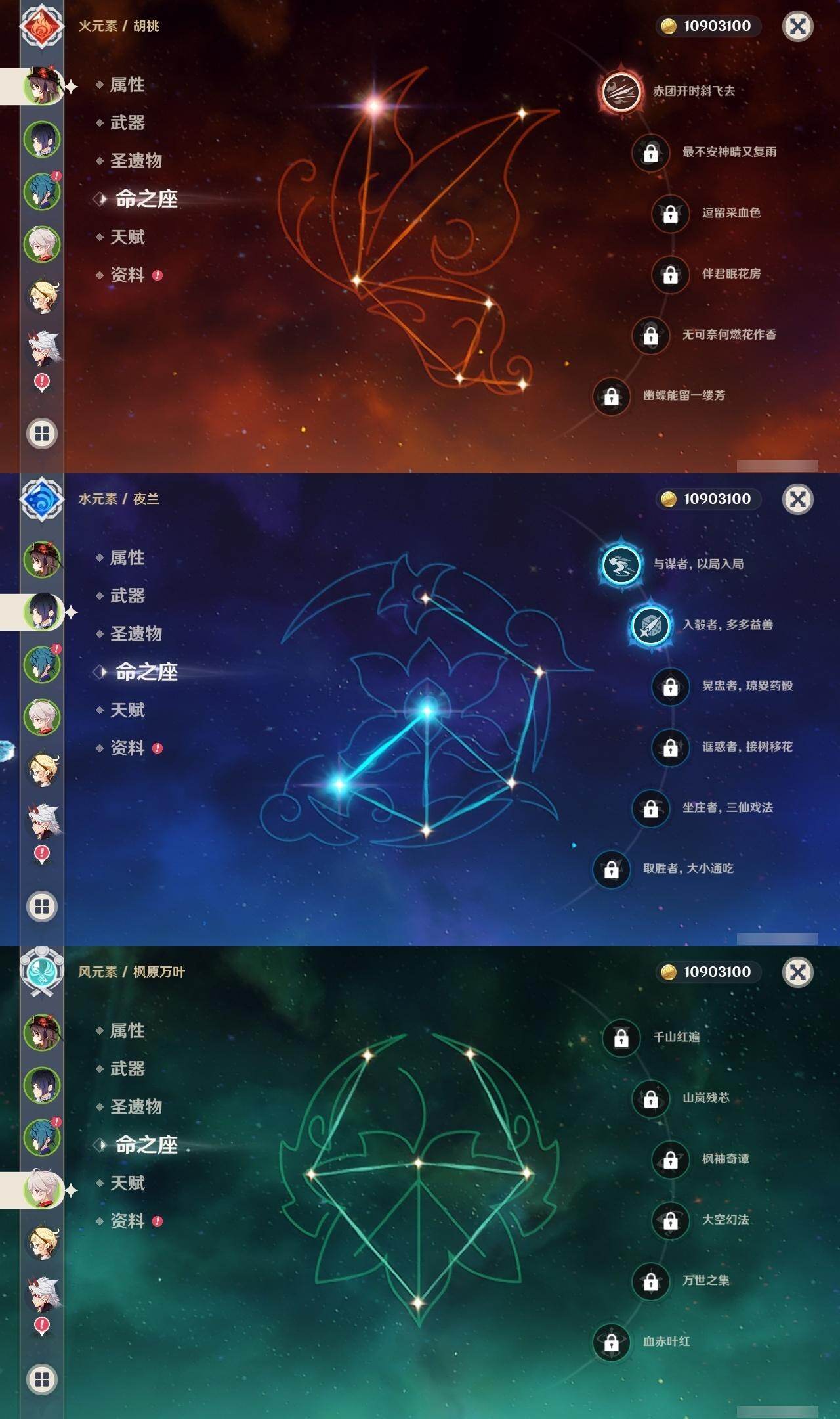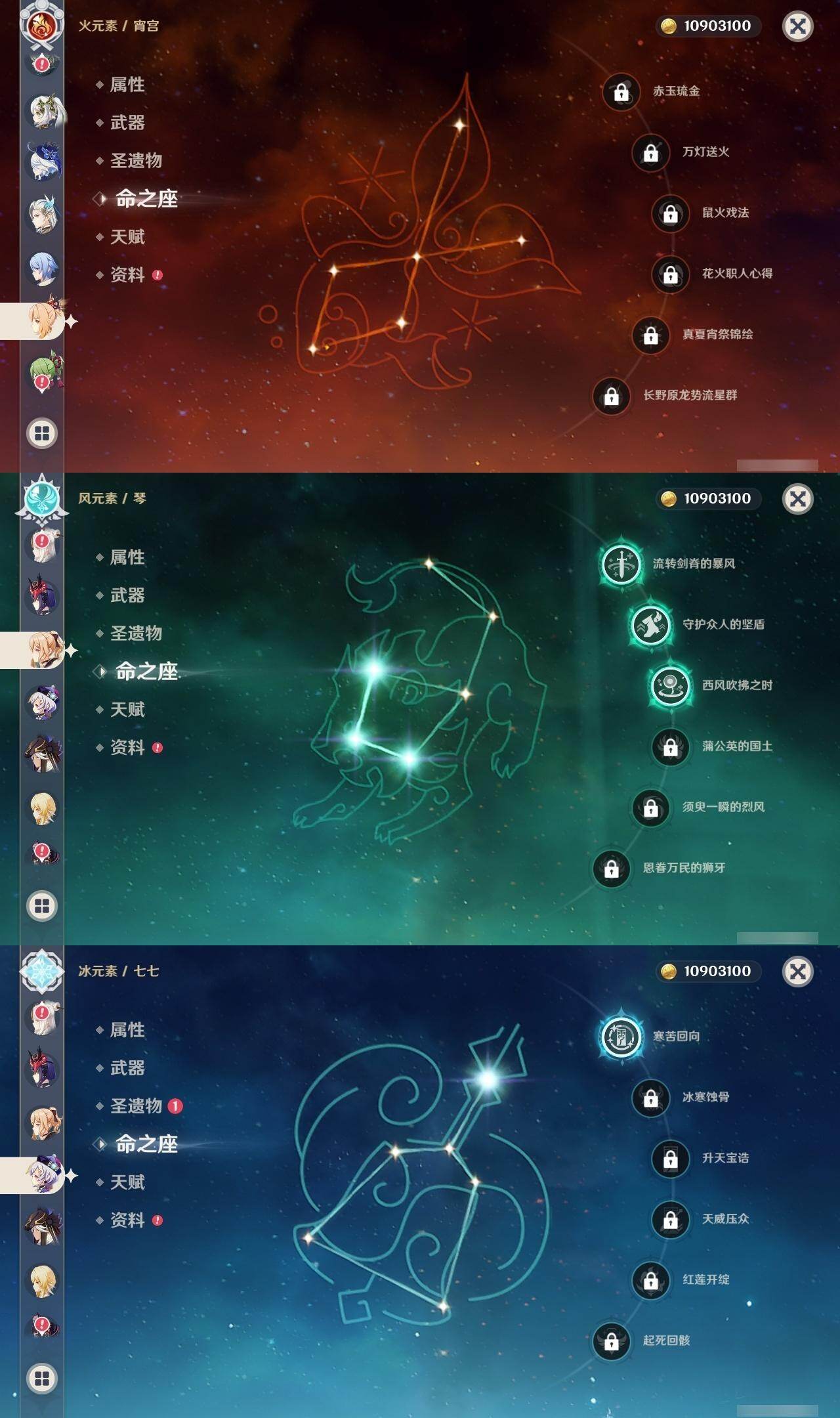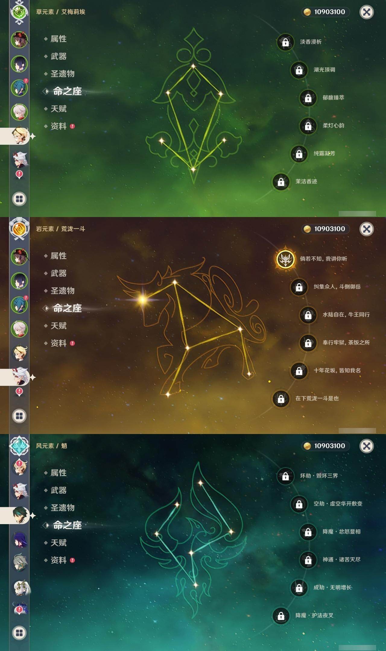 0命芙宁娜,0命那维莱特,0命艾尔海森,0命纳西妲,0命赛诺,2命夜兰,0命神里绫人,1命荒泷一斗,2命雷电将军,0命枫原万叶,1命胡桃,0命魈,0命宵宫,1命刻晴,1命七七,3命琴,0命莫娜,2命迪卢克,0命艾梅莉埃,0命法尔伽,精1最初的大魔术,精1碧落之珑,精1若水,精1薙草之稻光,精1雾切之回光,精1护摩之杖,精1四风原典,精1和璞鸢,精2天空之脊,精1天空之翼,精1尘世之锁,精1风鹰剑