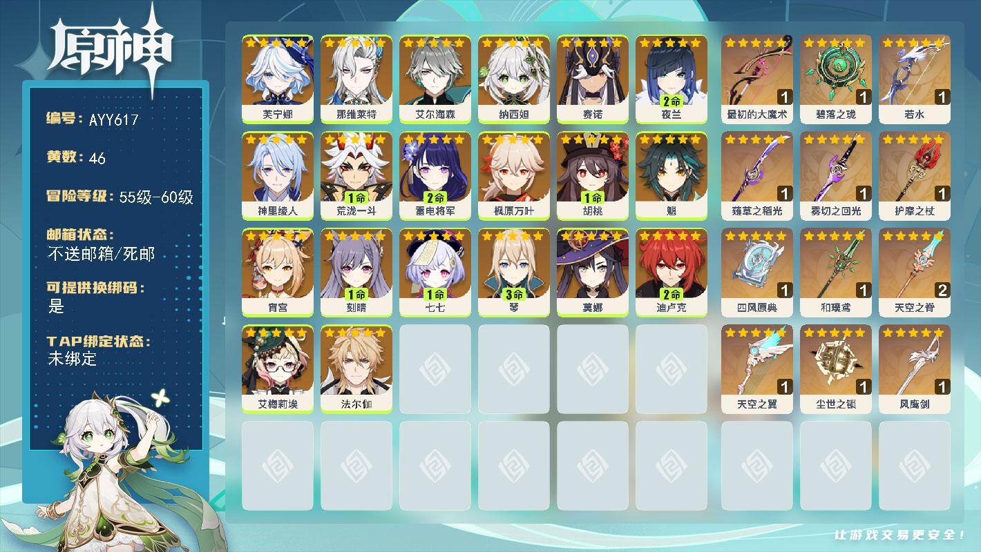 [17285726]59级/46黄/女主/20个五星角色/12个五星武器 0命芙宁娜,0命那维莱特,0命艾尔海森,0命纳西妲,0命赛诺,2命夜兰,0命神里绫人,1命荒泷一斗,2命雷电将军,0命枫原万叶,1命胡桃,0命魈,0命宵宫,1命刻晴,1命七七,3命琴,0命莫娜,2命迪卢克,0命艾梅莉埃,0命法尔伽,精1最初的大魔术,精1碧落之珑,精1若水,精1薙草之稻光,精1雾切之回光,精1护摩之杖,精1四风原典,精1和璞鸢,精2天空之脊,精1天空之翼,精1尘世之锁,精1风鹰剑