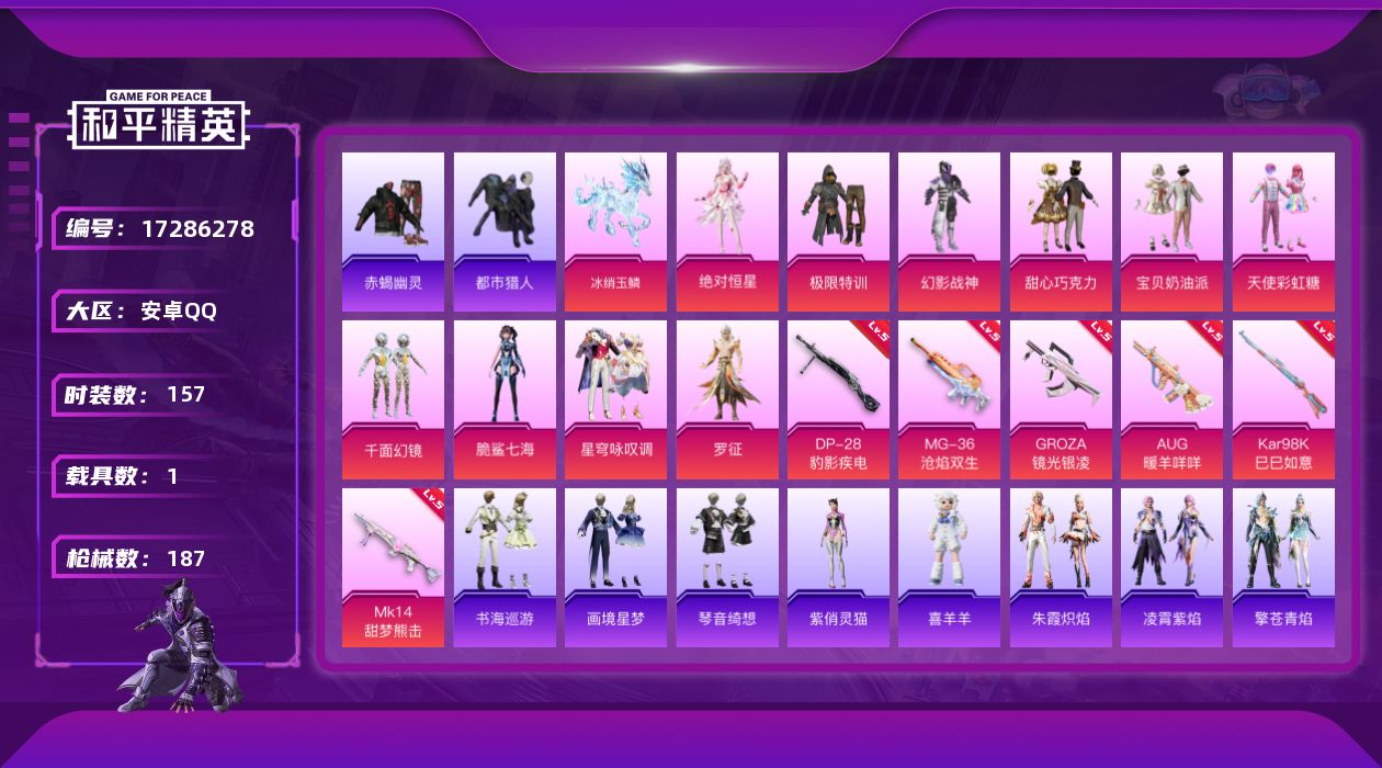 [17286278]安卓 手Q-11粉装-9特效枪-1载具-7粉色飞行器-59672热力值-5王牌印记-157套装-187枪皮