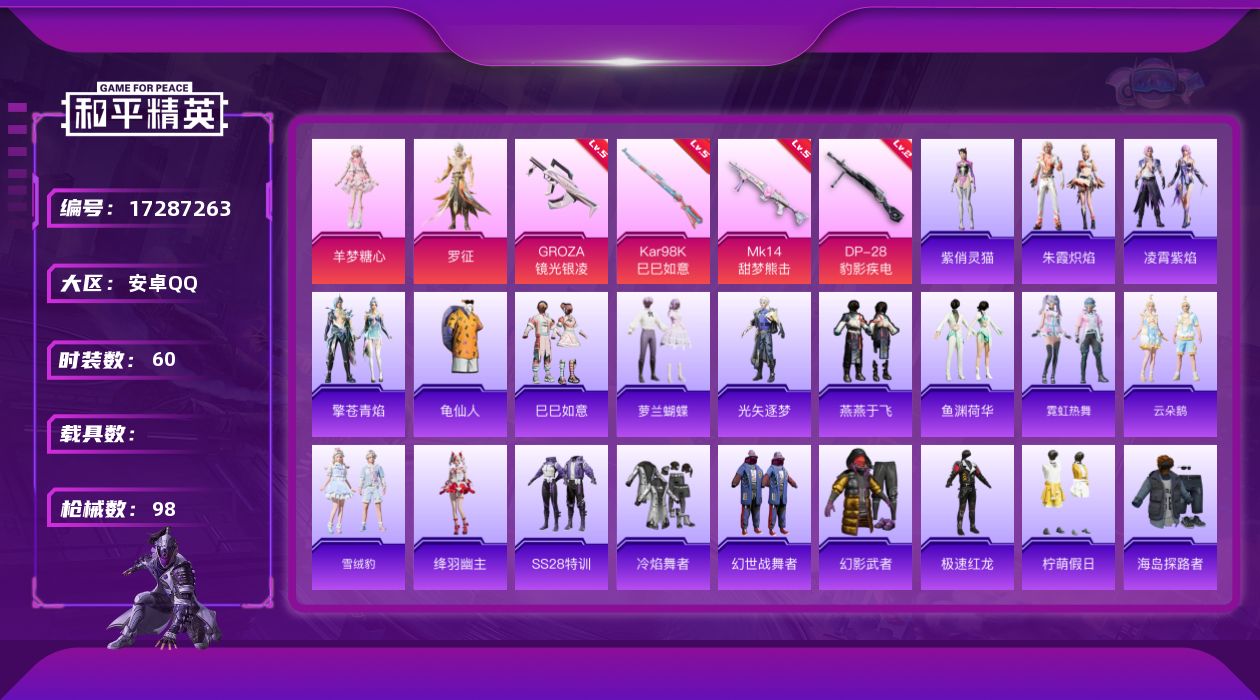 [17287263]安卓 手Q-2粉装-5特效枪-0载具-0粉色飞行器-24043热力值-1王牌印记-60套装-98枪皮 【热门品类】:套装-龟仙人 【粉色套装】:角色-罗征,角色-羊梦糖心 【粉色枪皮等级】:GROZA-镜光银凌(五级),Kar98K-巳巳如意(五级),Mk14-甜梦熊击(五级),DP-28-豹影疾电(二级) 【粉色枪皮】:GROZA-镜光银凌,Kar98K-巳巳如意,Mk14-甜梦熊击,Mk14-福马献瑞,DP-28-豹影疾电 【粉色降落伞】:洛神天依降落伞,沙丘之主降落伞,创世·救赎降落伞,月影灵韵降落伞,幻彩电音降落伞 【稀有套装】:套装-龟仙人,套装-巳巳如意,套装-萝兰蝴蝶,角色-光矢逐梦,套装-燕燕于飞,套装-鱼渊荷华,套装-霓虹热舞,套装-云朵鹅,套装-雪绒豹,角色-绛羽幽主,套装-朱霞炽焰,套装-凌霄紫焰,套装-擎苍青焰,角色-紫俏灵猫 【稀有枪皮】:AKM-破晓战魂,SCAR-L-夜灯,GROZA-荧海星豚,AUG-天降萌叽,AUG-耀粉歌者,QBZ-彩虹符号,M762-彩虹符号,M762-云朵鹅,AC-VAL-天降萌叽,蜜獾-天降萌叽,ARX-凌霄紫焰,UZI-天降萌叽,UMP45-夜灯,JS9-凌霄紫焰,P90-巳巳如意,Kar98K-红色方程式,M24-幻彩电音,SKS-炫彩节奏,SVD-云朵鹅,S686-巳巳如意,S12K-夜灯,DBS-创世·救赎,SPAS-12-云朵鹅,DP-28-彩虹符号,MG3-镜域双华,MG3-幻世战舞者,MG-36-凌霄紫焰,P92-凌霄紫焰,R45-幻彩电音,短管霰弹-竹节火铳,沙漠之鹰-云朵鹅,爆炸猎弓-惊鸿侠骨,爆炸猎弓-喜羊羊与灰太狼,大砍刀-云朵鹅,撬棍-冷漠罗丽,撬棍-咒蚀之裁,撬棍-沙丘之主权杖,平底锅-凌霄紫焰,破片手榴弹-巳巳如意 【其他套装】:套装-SS28特训,套装-冷焰舞者,套装-幻世战舞者,套装-幻影武者,套装-极速红龙,套装-柠萌假日,套装-海岛探路者,套装-特训学院,套装-猎鹰,套装-猛禽,套装-白色伏地魔,套装-破蛋小黄鸡,套装-竞技名士,套装-都市漫游者,套装-野性山猫,套装-长空猛禽,套装-青玉碎影,套装-魅力单车,套装-鹤鸣,套装-黄色伏地魔,套装-黄色名流,套装-黑色伏地魔,套装-龙的传人,套装-龟仙人,套装-纯真浪花,套装-热情海星 【营地ID】:984030147