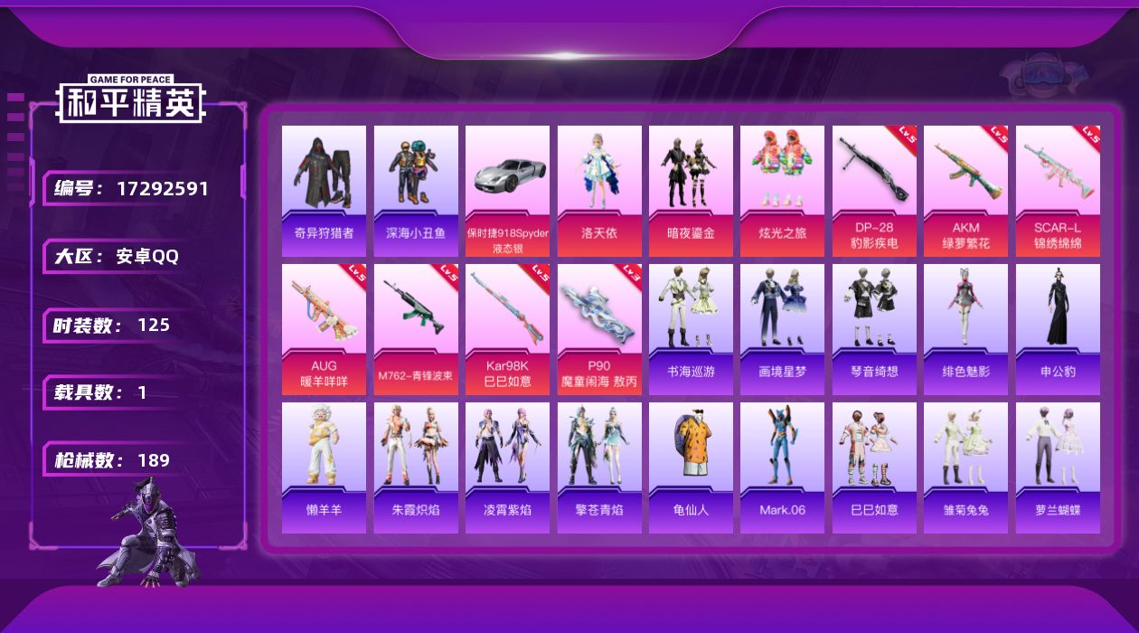 [17292591]安卓 手Q-3粉装-8特效枪-1载具-0粉色飞行器-57452热力值-9王牌印记-125套装-189枪皮 【热门品类】:套装-深海小丑鱼,套装-奇异狩猎者,套装-AG战队服,套装-龟仙人,角色-Mark.06 【粉色套装】:角色-洛天依,粉装-暗夜鎏金,粉装-炫光之旅 【粉色枪皮等级】:AKM-绿萝繁花(五级),SCAR-L-锦绣绵绵(五级),AUG-暖羊咩咩(五级),M762-青锋波束(五级),ACE32-萌骑漫游(四级),P90-魔童闹海 敖丙(三级),Kar98K-巳巳如意(五级),DP-28-豹影疾电(五级) 【粉色载具】:保时捷918 Spyder(液态银) 【粉色枪皮】:AKM-绿萝繁花,SCAR-L-锦绣绵绵,AUG-暖羊咩咩,M762-青锋波束,ACE32-萌骑漫游,P90-魔童闹海 敖丙,Kar98K-巳巳如意,DP-28-豹影疾电 【粉色降落伞】:绝对恒星降落伞,幻影战神降落伞,环太平洋降落伞,垂柳戏鸭降落伞,千面幻镜降落伞,歌者泠鸢降落伞,精灵梦叶罗丽降落伞,创世·救赎降落伞,赛博古神降落伞,异瞳寒姬降落伞,炫彩糖果降落伞 【稀有套装】:套装-龟仙人,套装-巳巳如意,套装-雪国风尚,套装-雏菊兔兔,套装-萝兰蝴蝶,套装-燕燕于飞,套装-鱼渊荷华,套装-朱霞炽焰,套装-凌霄紫焰,套装-擎苍青焰,玩偶服-懒羊羊,角色-申公豹,角色-绯色魅影,套装-书海巡游,套装-画境星梦,套装-琴音绮想,套装-红釉青花 【稀有枪皮】:AKM-奇异狩猎者,AKM-彩虹符号,AKM-霓虹街区,AKM-龙的传人,M16A4-红色方程式,SCAR-L-夜灯,SCAR-L-玉兔迎春,M416-糯团青竹,M416-绿野极光,M416-蓝色火焰,GROZA-2B战斗服款,GROZA-懵萌河马,GROZA-田园牧歌,AUG-天降萌叽,AUG-幻影战神,AUG-耀粉歌者,QBZ-彩虹符号,M762-天降萌叽,M762-彩虹甜喵,M762-暖熊萌萌,Mk47-妙红点点,G36C-懵萌河马,AC-VAL-彩虹甜喵,AC-VAL-快闪甜心,蜜獾-垂柳戏鸭,蜜獾-娇憨猪猪,ACE32-画境星梦,ARX-凌霄紫焰,UZI-啾咪啾咪,UZI-天降萌叽,UZI-娇憨猪猪,UZI-红色方程式,UMP45-夜灯,UMP45-涂山之恋,Vector-生命誓言,Vector-田园牧歌,Vector-音