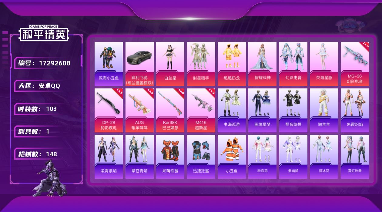 [17292608]安卓 手Q-6粉装-7特效枪-1载具-2粉色飞行器-46258热力值-9王牌印记-103套装-148枪皮