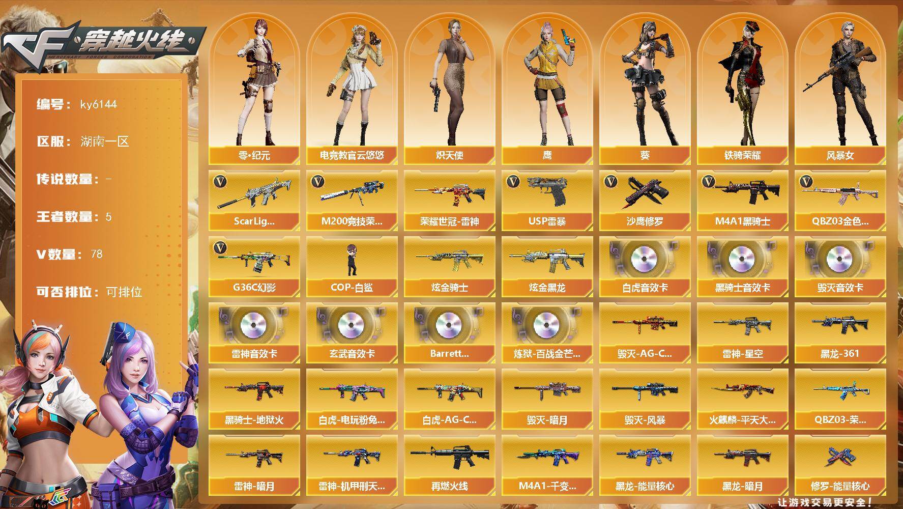 [17292807]湖南一区-82V-5王者武器数-2炫金武器数 【热门武器】:G36C-幻影,QBZ03-金色蔷薇,Scar Light-白虎,M200-竞技荣光,荣耀世冠-雷神,M4A1-黑骑士,COP-白鲨,USP-雷暴,沙鹰-修罗*3 【王者炫金武器】:炫金骑士,炫金黑龙 【音效卡】:M4A1-雷神音效卡,M4A1-黑骑士音效卡,Barrett-毁灭音效卡,Scar Light-白虎音效卡,M14EBR-玄武音效卡,Barrett-碧霄极光音效卡,炼狱-百战金芒-庆典舞曲音效卡 【皮肤】:白虎-AG-CFPLS20冠军,白虎-电玩粉兔皮肤,QBZ03-荣耀世冠EP 皮肤,雷神-暗月,雷神-星空,雷神-机甲刑天皮肤,M4A1-再燃火线,火麒麟-平天大圣,毁灭-暗月,毁灭-AG-CFPLS15冠军,毁灭-风暴,M4A1-千变-孔明皮肤,黑龙-能量核心,黑龙-暗月,M4A1-黑龙-361,黑骑士-地狱火,修罗-能量核心,轻型军用手斧-再燃火线 【角色】:葵,电竞教官-云悠悠,鹰,妮妮,零·纪元,葵-阿尔法武装,炽天使,风暴女,嘉年华灵狐,灵狐者-X,灵狐者-黄金海岸,龙儿,麻雀,潘多拉-X,潘多拉-甜心教官,铁骑荣耀,新娜塔莎,樱-缤纷夏日,影武者-X 【人偶武器】:COP-白鲨,Scar Light-马枪,AWM-灵狐-15周年嘉年华*2 【暴走生化】:超级对讲机 【挑战大师】:冰龙粉碎者-白马银枪,神圣爆裂者-末日III 【英雄级武器】:AK47-火麒麟,M4A1-黑龙,M4A1-雷神,M4A1-黑骑士,AK47-黑鲨,Scar Light-白虎,无影-神兵利器,G36C-幻影,M4A1-玫瑰精灵,QBZ03-金色蔷薇,王者风势-觉醒版,荣耀世冠-雷神,AWM-天龙,Barrett-毁灭,M200-竞技荣光,Barrett-金色蔷薇*2,王者之怒-觉醒版,沙鹰-修罗*3,沙鹰-天神*2,USP-雷暴,COP-雷霆,柯尔特-竞技荣光,柯尔特-荣耀世冠EP,USP-神工天巧,王者之魂-觉醒版,屠龙*2,龙啸,擎天,麒麟刺*3,擎天-竞技荣光,斩神刀-雷暴,麒麟刺-百战金芒,王者之锋-觉醒版,高爆手雷-雷霆,高爆手雷-雷暴,高爆手雷-竞技荣光*6,高爆手雷-神工天巧*3,闪光弹-雷霆,闪光弹-雷暴,闪光弹-竞技荣光*7,闪光弹-神工天巧*2,烟雾弹-雷霆,烟雾弹-雷暴,烟雾弹-竞技荣