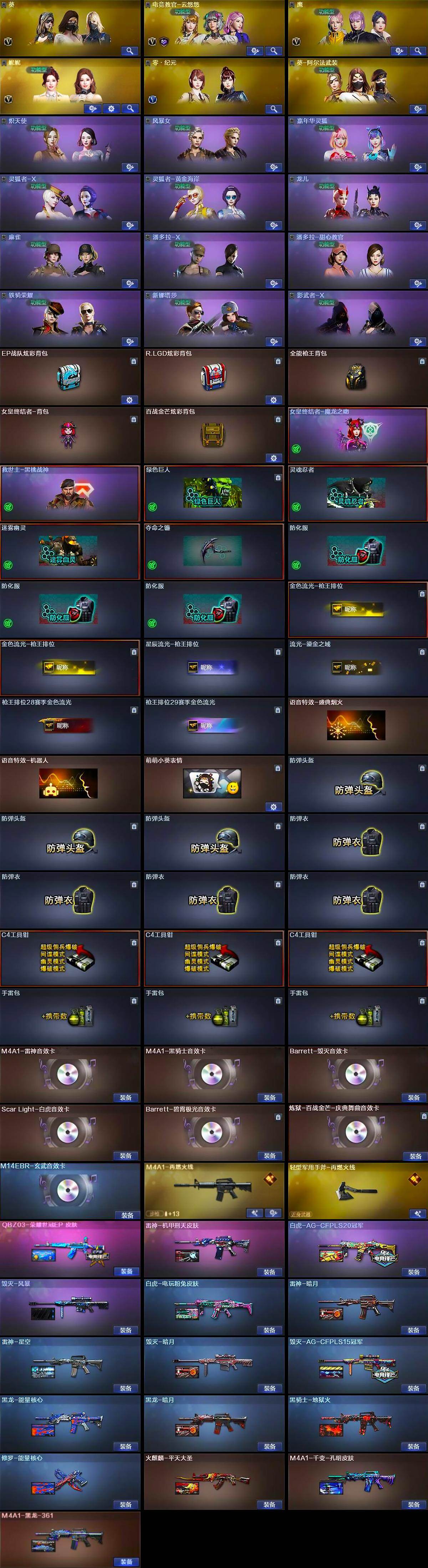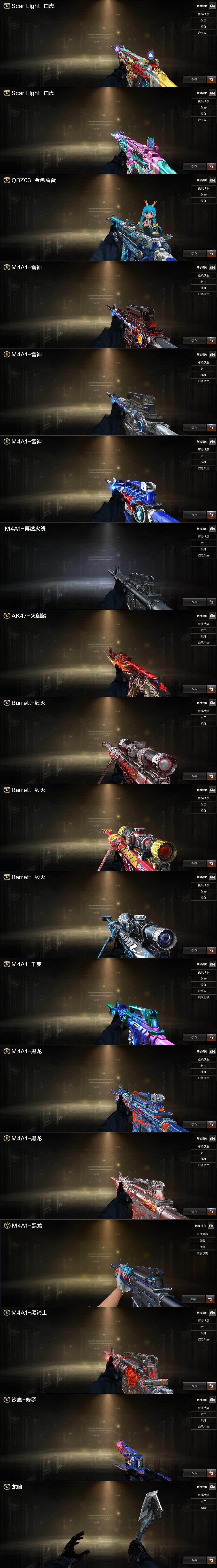 【音效卡】:M4A1-雷神音效卡,M4A1-黑骑士音效卡,Barrett-毁灭音效卡,Scar Light-白虎音效卡,M14EBR-玄武音效卡,Barrett-碧霄极光音效卡,炼狱-百战金芒-庆典舞曲音效卡