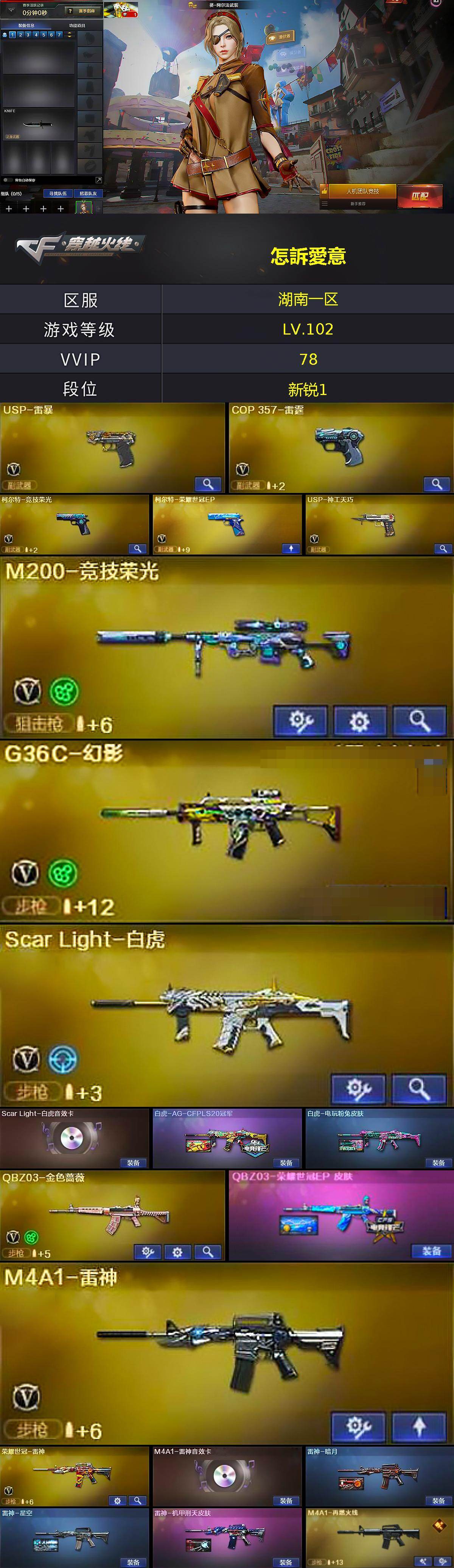 【热门武器】:G36C-幻影,QBZ03-金色蔷薇,Scar Light-白虎,M200-竞技荣光,荣耀世冠-雷神,M4A1-黑骑士,COP-白鲨,USP-雷暴,沙鹰-修罗*3
