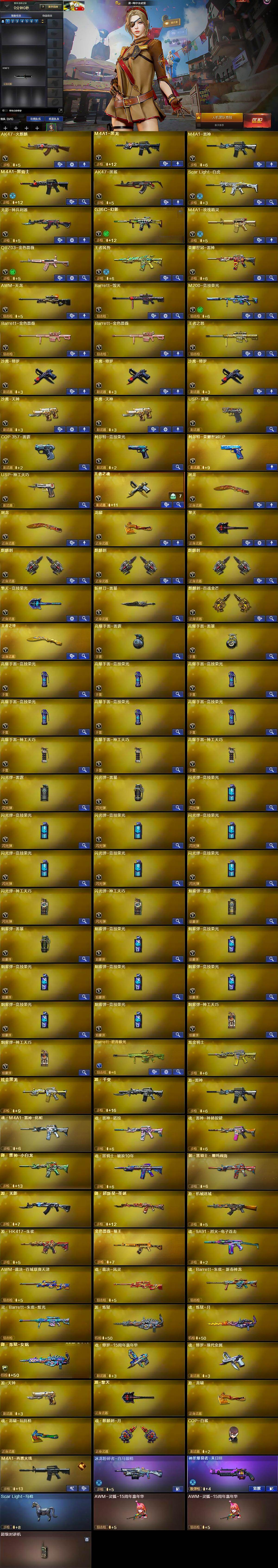 【英雄级武器】:AK47-火麒麟,M4A1-黑龙,M4A1-雷神,M4A1-黑骑士,AK47-黑鲨,Scar Light-白虎,无影-神兵利器,G36C-幻影,M4A1-玫瑰精灵,QBZ03-金色蔷薇,王者风势-觉醒版,荣耀世冠-雷神,AWM-天龙,Barrett-毁灭,M200-竞技荣光,Barrett-金色蔷薇*2,王者之怒-觉醒版,沙鹰-修罗*3,沙鹰-天神*2,USP-雷暴,COP-雷霆,柯尔特-竞技荣光,柯尔特-荣耀世冠EP,USP-神工天巧,王者之魂-觉醒版,屠龙*2,龙啸,擎天,麒麟刺*3,擎天-竞技荣光,斩神刀-雷暴,麒麟刺-百战金芒,王者之锋-觉醒版,高爆手雷-雷霆,高爆手雷-雷暴,高爆手雷-竞技荣光*6,高爆手雷-神工天巧*3,闪光弹-雷霆,闪光弹-雷暴,闪光弹-竞技荣光*7,闪光弹-神工天巧*2,烟雾弹-雷霆,烟雾弹-雷暴,烟雾弹-竞技荣