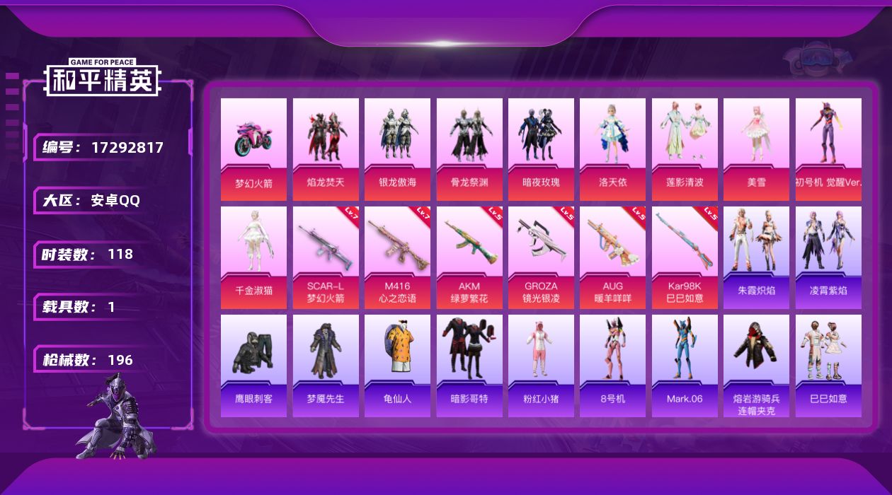 [17292817]【1412】安卓 手Q-9粉装-6特效枪-1载具-2粉色飞行器-58323热力值-12王牌印记-118套装-196枪皮