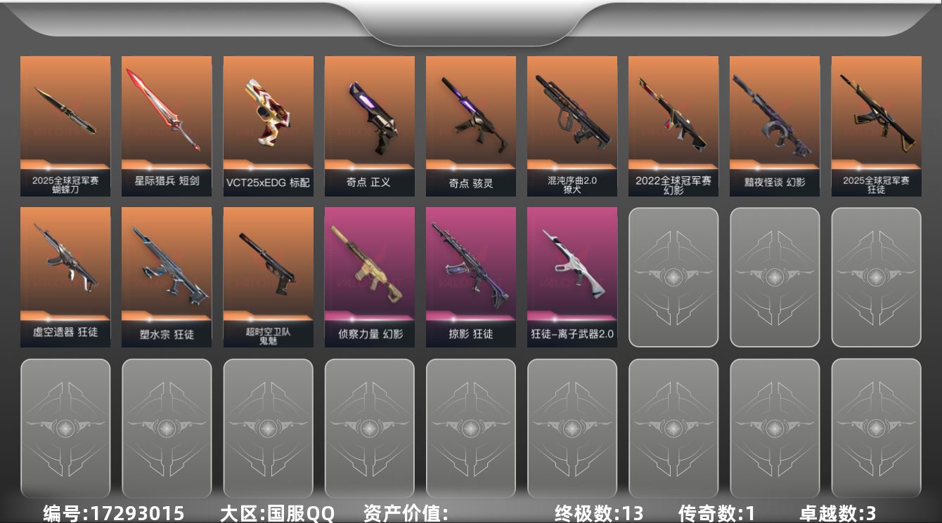 [17293015]【套装】:2025全球冠军赛套装+幻影-2022全球冠军赛 【英雄】:幻棱,炼狱,维斯,暮蝶,壹决,铁臂,捷风,雷兹,幽影,不死鸟,贤者,猎枭,蝰蛇,零,芮娜,奇乐,尚勃勒,霓虹,夜露,K/O,盖可,黑梦,钢锁 【近战 武器】:近战武器-2025全球冠军赛 蝴蝶刀,近战武器-影钩,近战武器-神之刃,近战武器-星际猎兵 短剑 【狂徒】:狂徒-2025全球冠军赛,狂徒-塑水宗,狂徒-虚空遗器,狂徒-掠影,狂徒-离子武器//2.0 【幻影】:幻影-2022全球冠军赛,幻影-黯夜怪谈,幻影-侦察力量 【獠犬】:獠犬-混沌序曲//2.0 【骇灵】:骇灵-奇点 【VCT手枪】:标配-VCT25 x EDG 【正义】:正义-奇点 【鬼魅】:鬼魅-超时空卫队 【卡面】:热舞环节 卡面,红鳞松叶 卡面,无畏契约GO!第一卷:芮娜 卡面,无畏契约GO!第一卷:零 卡面,《双城之战》金克丝 卡面,别冒尖 卡面,代号红色 卡面,新兵报到 卡面,V契约 卡面,无畏契约 卡面 【喷漆】:审判之爪 喷漆,买装还是存钱 喷漆,无畏契约GO!第一卷:奇乐 喷漆,胜利属于无畏契约 喷漆,GLHF 喷漆,无畏契约 喷漆 【挂饰】:鱼骨头 挂饰,薰衣草之心 挂饰,VCT x EDG 挂饰,天外飞客 挂饰,无畏契约 纪念币 挂饰