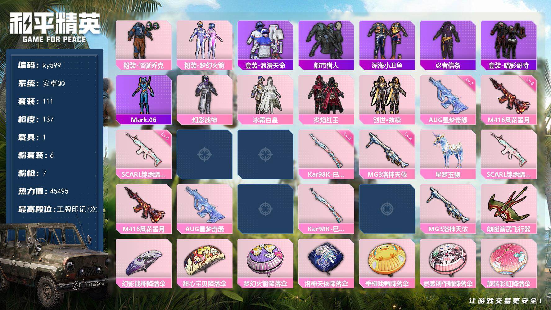 [17293421]安卓 手Q-6粉装-7特效枪-1载具-1粉色飞行器-45495热力值-7王牌印记-111套装-137枪皮