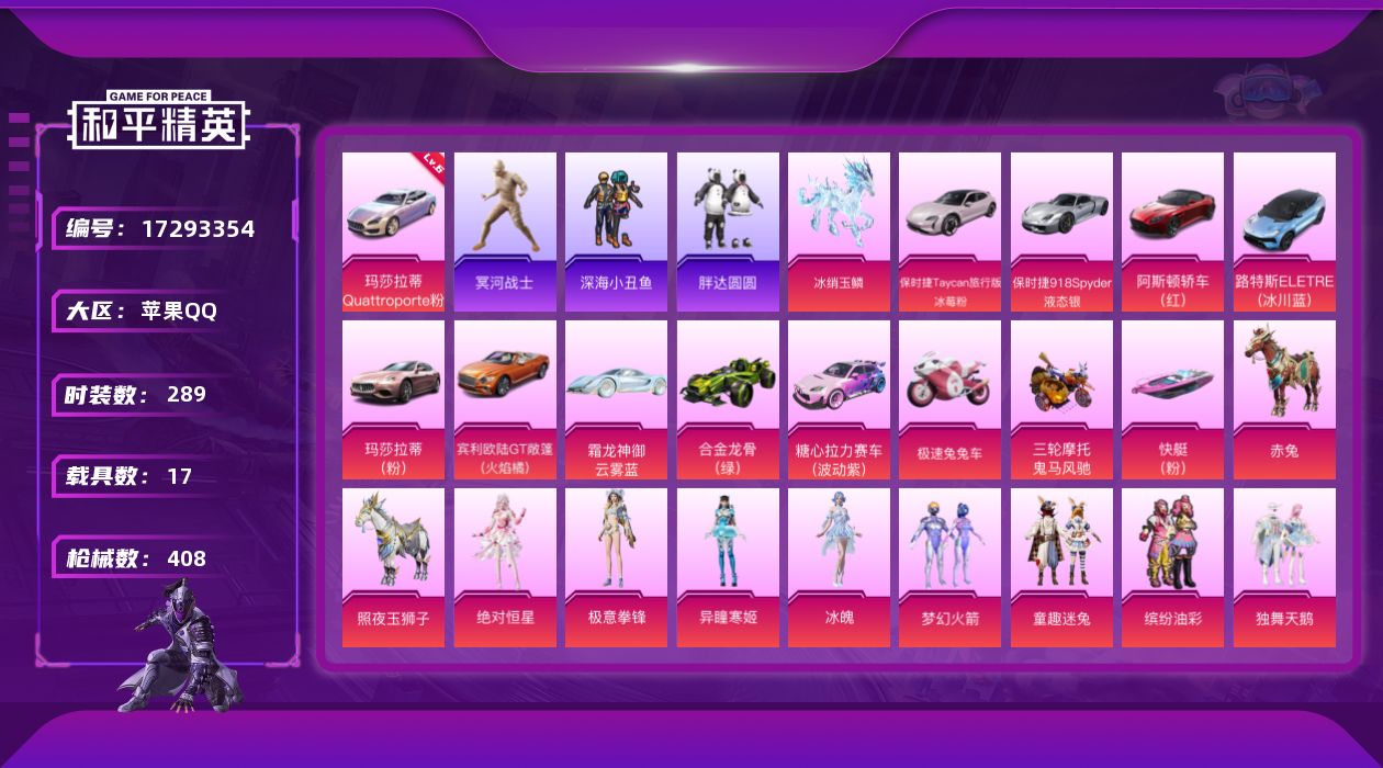 [17293354]苹果 手Q-37粉装-26特效枪-17载具-18粉色飞行器-181216热力值-20王牌印记-289套装-408枪皮 【红色载具】:玛莎拉蒂Quattroporte(幻星粉)(六级) 【热门品类】:粉装-梦幻火箭,粉装-童趣迷兔,粉装-缤纷油彩,套装-冥河战士,套装-深海小丑鱼,套装-小丑鱼,套装-胖达圆圆,角色-忠义严颜,套装-龟仙人,套装-潮萌小黄鸭,套装-暗影哥特,套装-粉红小猪,套装-糯粉咩咩,角色-Mark.06,大砍刀-青龙偃月刀,撬棍-龙胆亮银枪,套装-红熊茄茄 【粉色套装】:粉装-独舞天鹅,角色-绝对恒星,粉装-甜心巧克力,粉装-宝贝奶油派,粉装-天使彩虹糖,粉装-梦幻火箭,粉装-缤纷油彩,粉装-极致幻想,粉装-冰霜白皇,粉装-童趣迷兔,粉装-炙焰红王,粉装-山涧鹿灵,角色-洛天依,粉装-天之羽翼,粉装-焦糖拿铁,粉装-碧影闪光,粉装-薄荷物语,粉装-橘柚倾心,粉装-炙焰牛王,粉装-寒光使者,粉装-第五大道,粉装-仲夏莫吉托,角色-白勺歌姬,角色-呆萌星弥,角色-小可学妹,粉装-闲梦青缨,角色-千金淑猫,角色-月影灵韵,角色-樱桃泡泡,角色-狂魅哈莉,角色-荧海星豚,角色-绯穹魔姬,角色-奇迹舞步 贝贝,角色-奇迹舞步 美琪,角色-冰魄,角色-异瞳寒姬,粉装-极意拳锋 【粉色枪皮等级】:AKM-甜心宝贝(一级),AKM-梦之光华(七级),SCAR-L-童趣迷兔(七级),SCAR-L-魔童闹海 哪吒(三级),M416-心之恋语(二级),M416-至情至圣(九级),GROZA-焦糖拿铁(五级),AUG-星之彼岸(七级),AUG-妙趣可丽(一级),蜜獾-荧海星豚(四级),UMP45-恐龙拽拽(四级),Vector-绯穹魔姬(四级),AKS-74U-森灵之息(五级),Kar98K-巳巳如意(五级),AWM-橘柚倾心(四级),Mk14-福马献瑞(一级),M417-第五大道(五级),M249-霁蓝缠春(四级),DP-28-豹影疾电(五级),MG3-洛神天依(五级),MG-36-沧焰双生(五级),平底锅-喜羊羊与灰太狼(三级),烟雾弹-电雾迷城(三级) 【粉色载具】:玛莎拉蒂Quattroporte(幻星粉),阿斯顿马丁DBS(红),路特斯ELETRE(冰川蓝),玛莎拉蒂Ghibli(粉),宾利欧陆GT敞篷(火焰橘),霜龙神御(云雾蓝),保时捷Taycan 旅行