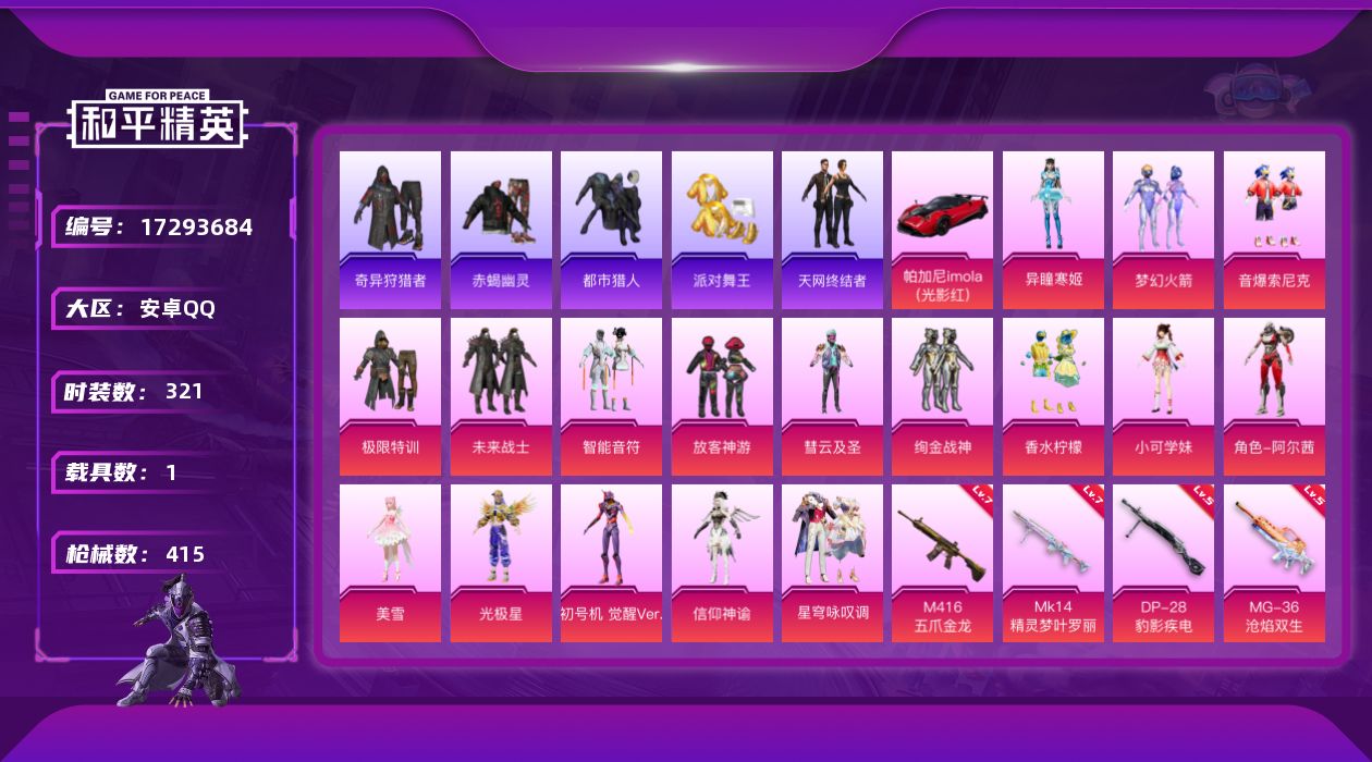 [17293684]安卓 手Q-18粉装-20特效枪-1载具-11粉色飞行器-134881热力值-15王牌印记-321套装-415枪皮