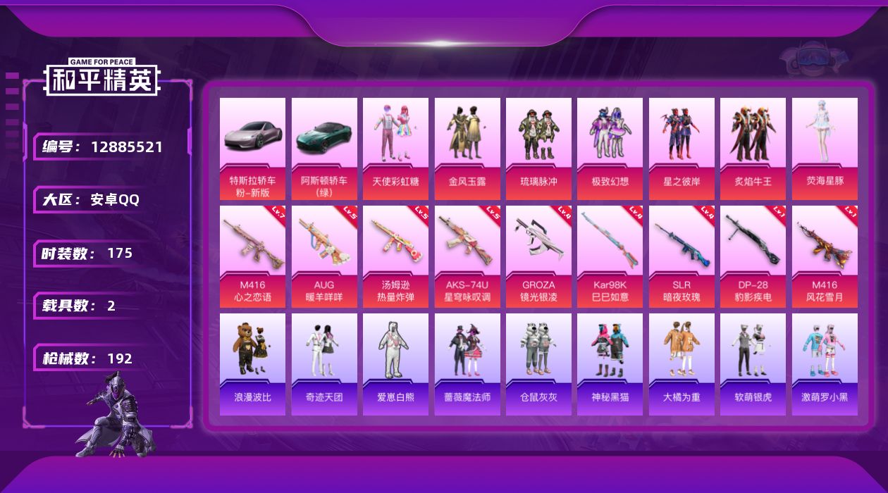 [12885521]【1364】安卓 手Q-7粉装-9特效枪-2载具-4粉色飞行器-70882热力值-9王牌印记-175套装-192枪皮 【热门品类】:套装-浪漫天命,旭日初心兜帽大衣,套装-浪漫波比,熔岩游骑兵面罩 【粉色载具】:特斯拉Roadster(沁心粉),阿斯顿马丁DBS(绿) 【粉色套装】:粉装-天使彩虹糖,粉装-金风玉露,粉装-琉璃脉冲,粉装-极致幻想,粉装-星之彼岸,粉装-炙焰牛王,角色-荧海星豚 【粉色枪皮等级】:M416-心之恋语(七级),M416-风花雪月(一级),GROZA-镜光银凌(四级),AUG-暖羊咩咩(五级),汤姆逊-热量炸弹(五级),AKS-74U-星穹咏叹调(五级),Kar98K-巳巳如意(四级),SLR-暗夜玫瑰(四级),DP-28-豹影疾电(一级) 【粉色枪皮】:M416-心之恋语,M416-风花雪月,GROZA-镜光银凌,AUG-暖羊咩咩,汤姆逊-热量炸弹,AKS-74U-星穹咏叹调,Kar98K-巳巳如意,SLR-暗夜玫瑰,DP-28-豹影疾电 【粉色飞行器】:心之恋语飞行翼,齐天大圣飞行器,万象金身飞行器,雀灵庇佑飞行器 【粉色降落伞】:甜心宝贝降落伞,梦幻火箭降落伞,神秘黑猫降落伞,四圣焕新降落伞,银刃赛罗降落伞,王牌四分卫降落伞,暗夜玫瑰降落伞,蓝莓炮弹降落伞,金蛇镇世降落伞,鬼刀降落伞,樱桃泡泡降落伞 【稀有套装】:套装-燕燕于飞,套装-鱼渊荷华,套装-自由猎手,角色-蜜桃派对,套装-粉恋花,套装-紫幽梦,套装-蓝冰羽,套装-星渊小夜曲,套装-彩虹兔,套装-云朵鹅,套装-雪绒豹,角色-夜瞳黯灵 【稀有枪皮】:AKM-冰凉西瓜,AKM-四圣焕新,AKM-彩虹符号,AKM-灼热熔岩,AKM-破晓战魂,AKM-萌趣颜团子,AKM-虎虎生威,AKM-龙的传人,M16A4-凝视深渊,M16A4-夜灯,M16A4-魔法学院,SCAR-L-暗夜玫瑰,SCAR-L-炫彩节奏,SCAR-L-甜蜜誓约,SCAR-L-生命誓言,SCAR-L-红色方程式,SCAR-L-黄金龙骨,M416-仓鼠灰灰,M416-神秘黑猫,M416-糯团青竹,M416-红色方程式,M416-蓝色火焰,GROZA-异彩先驱,GROZA-彩虹符号,GROZA-春暖花开,GROZA-治愈之星,GROZA-生命誓言,GROZA-荧海星豚,AUG-凝视深渊,AUG-天降萌叽,AUG-耀粉
