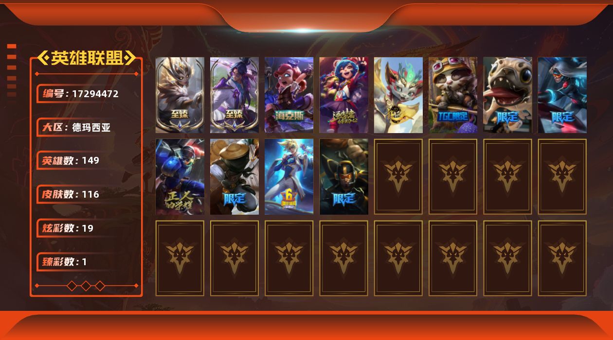 [17294472]青铜段位-149英雄-116皮肤-19炫彩-0终极-4神话-13限定-15传说-23史诗