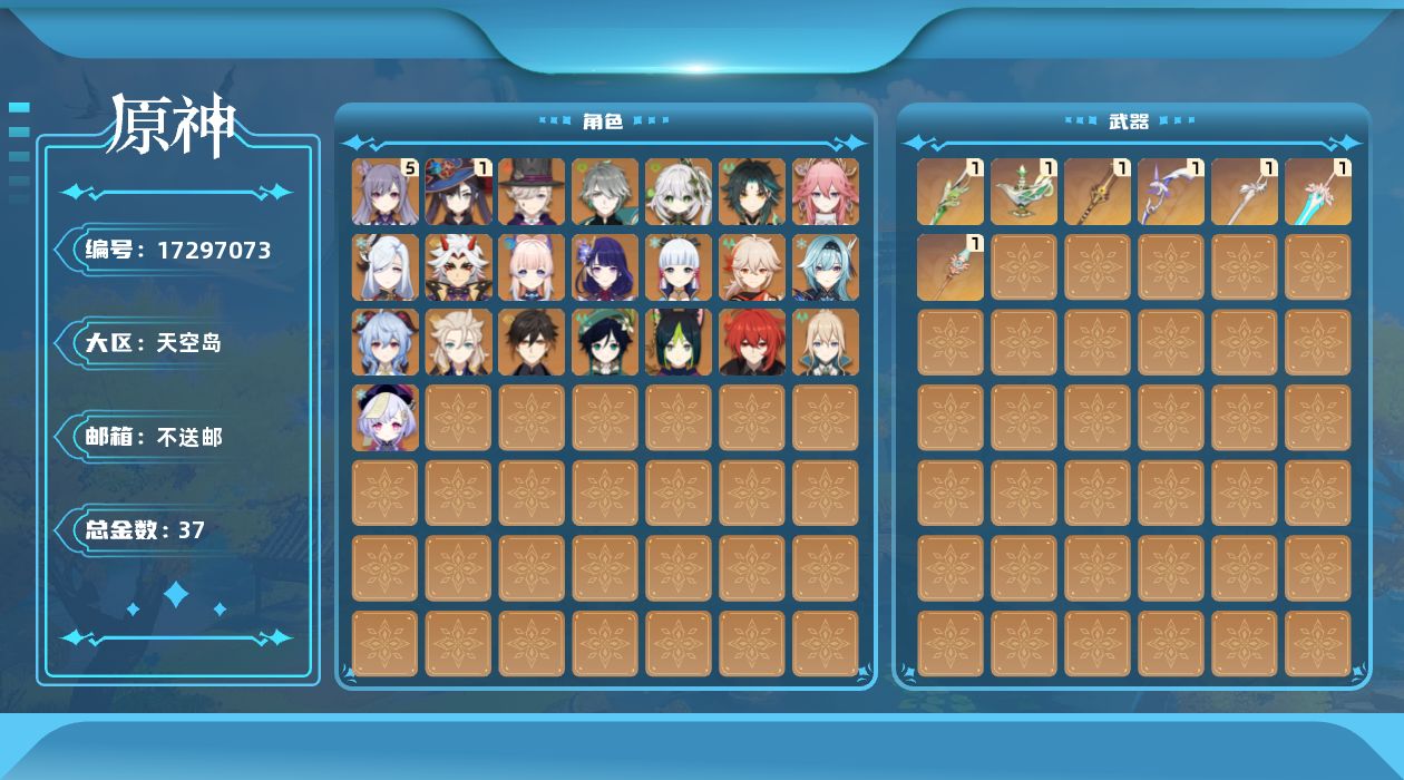 0命林尼,0命艾尔海森,0命纳西妲,0命提纳里,0命八重神子,0命申鹤,0命荒泷一斗,0命优菈,0命雷电将军,0命枫原万叶,0命神里绫华,0命钟离,0命甘雨,0命魈,0命温迪,0命阿贝多,0命珊瑚宫心海,5命刻晴,0命七七,0命琴,1命莫娜,0命迪卢克,精1裁叶萃光,精1千夜浮梦,精1赤沙之杖,精1天空之脊,精1阿莫斯之弓,精1风鹰剑,精1天空之傲