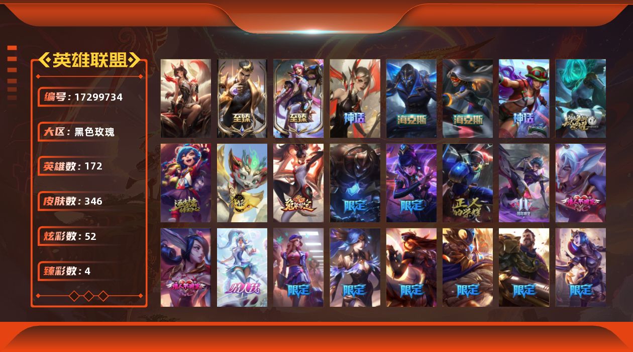 [17299734]【特价出售/店主推荐】未定级段位-172英雄-346皮肤-52炫彩-0终极-9神话-47限定-49传说-84史诗