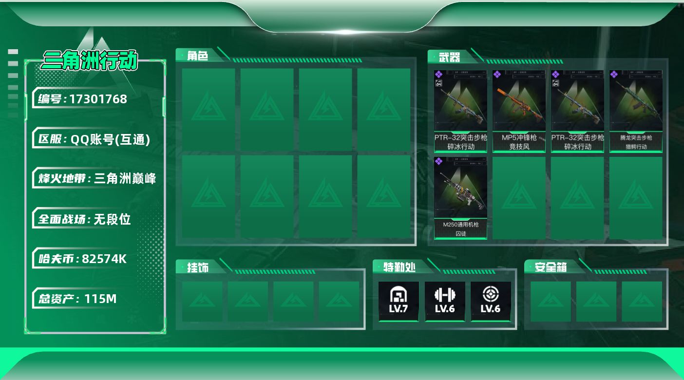 [17301768]【特价出售/店主推荐】 115m总资产-82574k哈伏币-60烽火等级-三角洲巅峰-1战场等级-无军衔 【近战皮肤】:近战-黑鹰 【史诗外观】:PTR-32突击步枪-碎冰行动,腾龙突击步枪-猎鳄行动,MP5冲锋枪-竞技风,M250通用机枪-囚徒 【稀有外观】:沙漠之鹰-天际线,M700狙击步枪-旧梦,AKM突击步枪-肃杀,SCAR-H战斗步枪-荣耀列队,K437突击步枪-生存指令,MK47突击步枪-精英联盟,SMG-45-行动开启 【普通外观】:R93狙击步枪-凶兽,AUG突击步枪-浅蓝涂装,M7战斗步枪-红色涂装,UZI冲锋枪-海色,QCQ171冲锋枪-三角洲力量,M1014霰弹枪-高雅黑,沙漠之鹰-海浪,93R-三角洲力量 【军牌】:军牌-静谧时光,军牌-永恒,军牌-信誉优秀,军牌-小心鳄鱼 【挂饰】:挂饰-崩岩重炮*3,挂饰-暗行哨兵*4