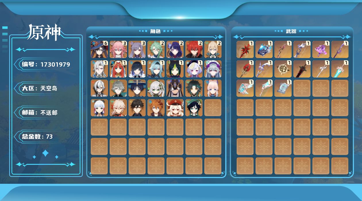 0命阿蕾奇诺,1命那维莱特,2命白术,0命艾尔海森,0命流浪者,0命纳西妲,1命妮露,0命赛诺,1命提纳里,1命夜兰,3命八重神子,1命优菈,2命雷电将军,0命枫原万叶,0命神里绫华,0命钟离,0命魈,0命温迪,0命可莉,0命达达利亚,0命珊瑚宫心海,3命刻晴,1命七七,2命琴,满命莫娜,2命迪卢克,0命梦见月瑞希,0命菲林斯,精1赤月之形,精1万世流涌大典,精1最初的大魔术,精1若水,精1神乐之真意,精1薙草之稻光,精1护摩之杖,精1四风原典,精1天空之翼,精1阿莫斯之弓,精1天空之卷,精1尘世之锁,精1风鹰剑,精1狼的末路,精1天空之傲