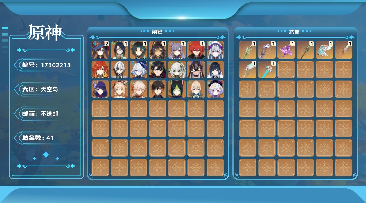 0命阿蕾奇诺,1命闲云,0命芙宁娜,0命莱欧斯利,1命迪希雅,0命纳西妲,0命赛诺,0命提纳里,0命夜兰,0命雷电将军,0命枫原万叶,0命钟离,1命魈,0命宵宫,1命刻晴,0命七七,0命琴,2命莫娜,1命迪卢克,0命玛薇卡,0命梦见月瑞希,0命丝柯克,0命菲林斯,0命杜林,精1裁叶萃光,精1若水,精1神乐之真意,精1和璞鸢,精1天空之脊,精1天空之翼,精1天空之刃,精1天空之卷,精1血染荒城
