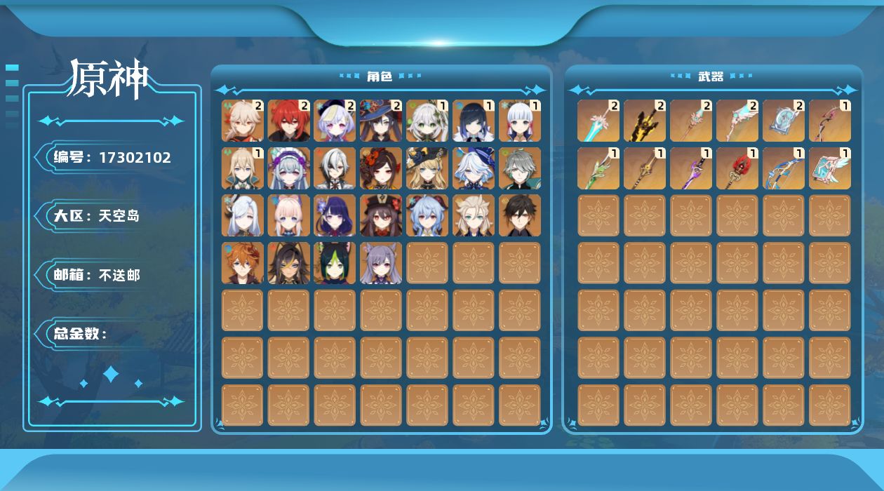 [17302102]【金色角色】:梦见月瑞希(0命),阿蕾奇诺(0命),千织(0命),娜维娅(0命),芙宁娜(0命),迪希雅(0命),艾尔海森(0命),纳西妲(1命),提纳里(0命),夜兰(1命),申鹤(0命),珊瑚宫心海(0命),雷电将军(0命),神里绫华(1命),枫原万叶(2命),胡桃(0命),甘雨(0命),阿贝多(0命),钟离(0命),达达利亚(0命),琴(1命),刻晴(0命),迪卢克(2命),莫娜(2命),七七(2命) 【拥有武器】:最初的大魔术(精1),裁叶萃光(精1),赤沙之杖(精1),雾切之回光(精1),终末嗟叹之诗(精1),护摩之杖(精1),无工之剑(精2),天空之傲(精2),天空之卷(精1),四风原典(精2),天空之脊(精2),天空之翼(精2) 【紫色角色】:爱诺(0命),卡齐娜(0命),嘉明(2命),夏沃蕾(1命),夏洛蒂(0命),菲米尼(1命),琳妮特(4命),绮良良(0命),米卡(0命),瑶瑶(5命),珐露珊(2命),莱依拉(3命),坎蒂丝(3命),多莉(满命),柯莱(5命),鹿野院平藏(满命),久岐忍(3命),云堇(满命),五郎(5命),托马(5命),九条裟罗(满命),早柚(1命),烟绯(满命),罗莎莉亚(满命),辛焱(满命),迪奥娜(满命),砂糖(满命),雷泽(满命),菲谢尔(满命),丽莎(1命),北斗(满命),香菱(满命),安柏(2命),班尼特(满命),行秋(满命),芭芭拉(满命),凝光(满命),诺艾尔(满命),凯亚(1命),重云(满命)