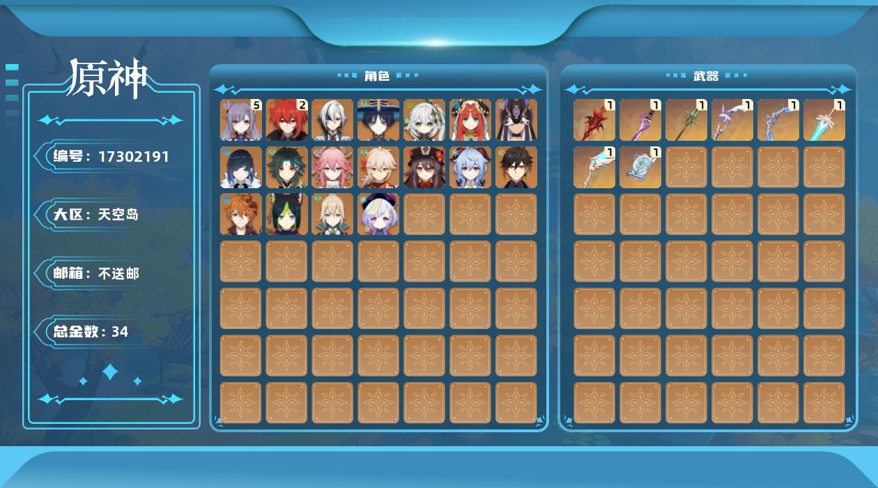 0命阿蕾奇诺,0命流浪者,0命纳西妲,0命妮露,0命赛诺,0命提纳里,0命夜兰,0命八重神子,0命枫原万叶,0命钟离,0命胡桃,0命甘雨,0命魈,0命达达利亚,5命刻晴,0命七七,0命琴,2命迪卢克,精1赤月之形,精1冬极白星,精1雾切之回光,精1四风原典,精1和璞鸢,精1天空之翼,精1阿莫斯之弓,精1天空之傲