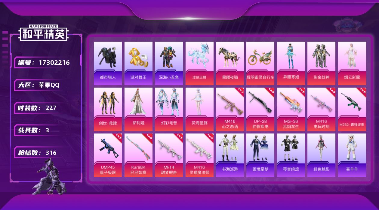 [17302216]苹果 手Q-8粉装-11特效枪-3载具-10粉色飞行器-101882热力值-20王牌印记-227套装-316枪皮【热门品类】:套装-浪漫天命,套装-都市猎人,套装-派对舞王,套装-深海小丑鱼,套装-小丑鱼,角色-军刀雅典娜,套装-龟仙人,套装-暗影哥特,角色-Mark.06【粉色套装】:粉装-绚金战神,角色-烟云彩露,套装-创世·救赎,角色-萨利娅,粉装-幻彩电音,角色-荧海星豚,角色-异瞳寒姬,角色-罪夜之冕【粉色枪皮等级】:M416-心之恋语(七级),M416-电玩时刻(五级),M416-灵猫魔法师(三级),M762-青锋波束(五级),UMP45-量子极限(五级),AKS-74U-森灵之息(五级),Kar98K-巳巳如意(五级),Mk14-甜梦熊击(五级),Mk14-福马献瑞(二级),DP-28-豹影疾电(五级),MG-36-沧焰双生(五级)【粉色载具】:黑曜夜骑,冰绡玉鳞,辉羽雀灵自行车【粉色枪皮】:M416-心之恋语,M416-电玩时刻,M416-灵猫魔法师,M762-青锋波束,UMP45-量子极限,AKS-74U-森灵之息,Kar98K-巳巳如意,Mk14-甜梦熊击,Mk14-福马献瑞,DP-28-豹影疾电,MG-36-沧焰双生【粉色飞行器】:炫彩糖果飞行器,镜光幻境飞行翼,圣域金龙飞行器,雀灵庇佑飞行器,御兔特攻飞行器,终晖之翼飞行器,灵猫魔法师飞行器,桃源时光飞行器,灵珠游龙飞行器