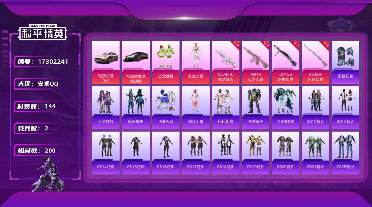 [17302241]【店主推荐捡漏号】安卓 手Q-2粉装-6特效枪-2载具-3粉色飞行器-62407热力值-10王牌印记-144套装-200枪皮【热门品类】:套装-浪漫天命,套装-粉红小猪【粉色套装】:粉装-恐龙拽拽,角色-圣堂之誓【粉色枪皮等级】:SCAR-L-纯梦嫁纱(七级),M416-心之恋语(七级),Kar98K-巳巳如意(五级),Mk14-福马献瑞(三级),AA12-G-萌骑幻想(二级),DP-28-豹影疾电(五级)【粉色载具】:玛莎拉蒂Ghibli(粉),布加迪威龙(律动橙)【粉色枪皮】:SCAR-L-纯梦嫁纱,M416-心之恋语,Kar98K-巳巳如意,Mk14-福马献瑞,AA12-G-萌骑幻想,DP-28-豹影疾电