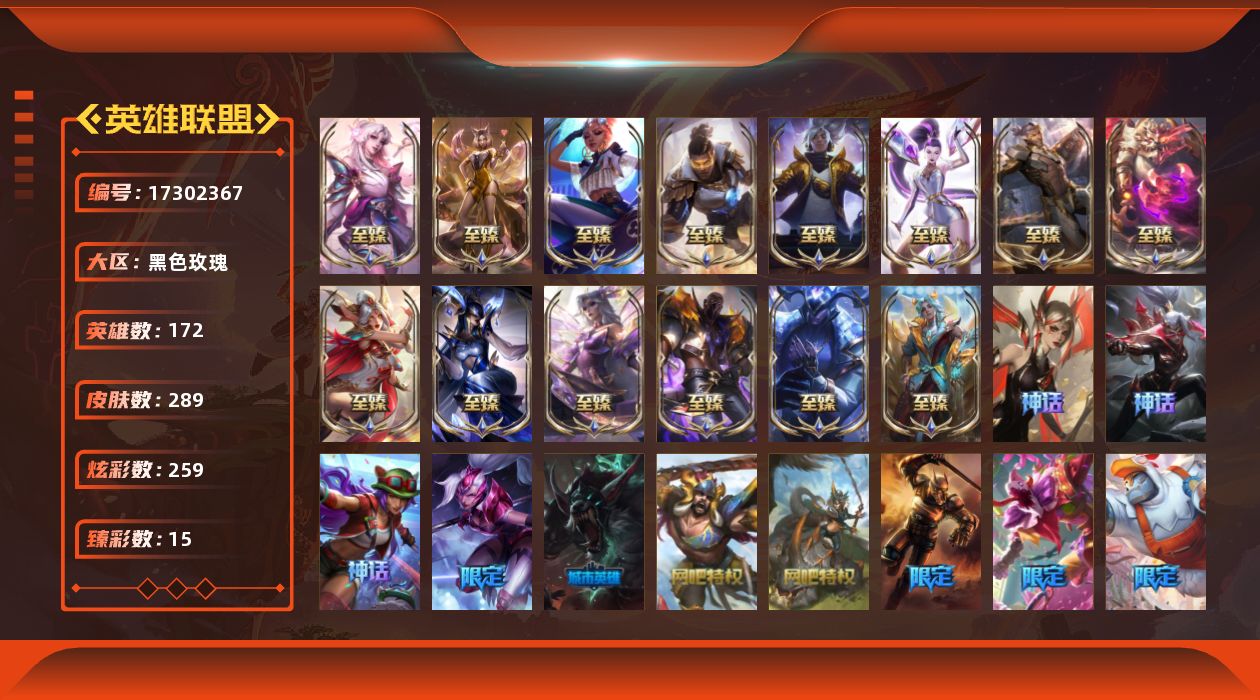 [17302367]【特价出售/店主推荐】铂金段位-172英雄-289皮肤-259炫彩-0终极-20神话-40限定-29传说-35史诗